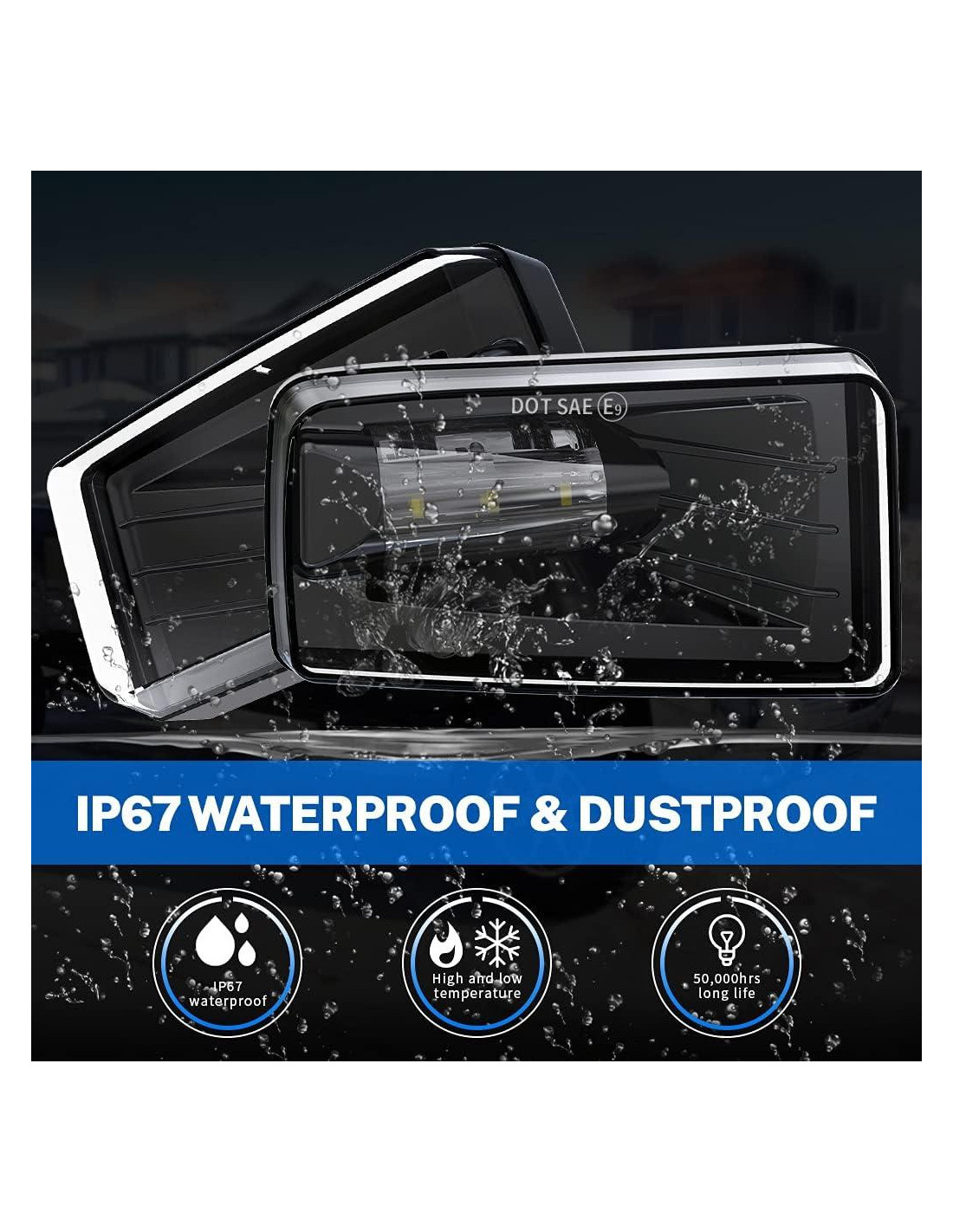 - Alto Rendimiento - Válvula de respiración para prevenir agua, estándar impermeable IP67. Lente de PC irrompible y carcasa de aleación de aluminio para una excelente disipación del calor. Sin problemas de parpadeo, soporta la mayoría de las condiciones climáticas adversas, Lluvias Fuertes, Nieve o Niebla Densa, etc.