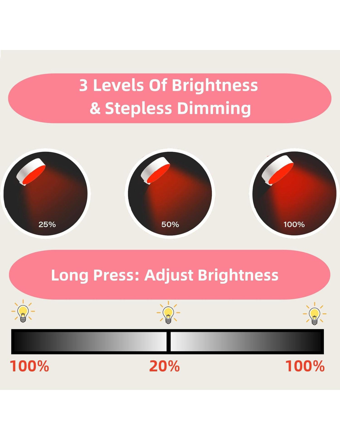 - Tres modos y ajuste de brillo: Esta lámpara de clip para libros está diseñada con tres modos de brillo: 25%, 50% y 100%. Si estos tres modos de brillo aún no son adecuados para ti, puedes mantener presionado el botón para ajustar el brillo de la luz roja.