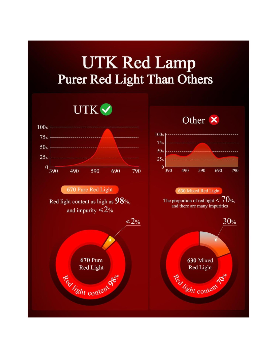 - [ Luz roja más pura ] : Las lámparas de luz roja comunes en el mercado utilizan una longitud de onda de 630nm, y la proporción real de luz roja efectiva es inferior al 70%. UTK utiliza una longitud de onda de 670nm (6 pcs), asegurando que la luz roja represente hasta el 98%, emitiendo una luz roja más pura.