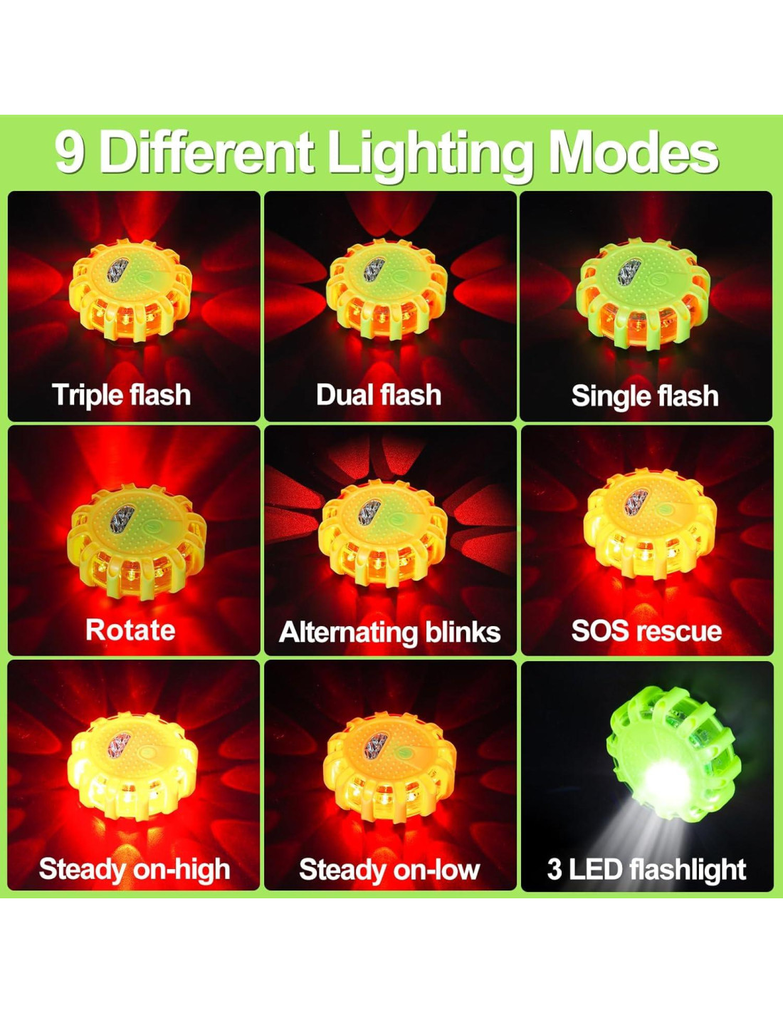 - [9 PATRONES DE LUZ DE EMERGENCIA DIFERENTES] - Cada luz de señal de seguridad LED tiene 9 patrones de luz que incluyen estroboscópico, rotativo, SOS y linterna de 3 LED, etc., tanto para uso de emergencia marina como en carretera. También se pueden usar para actividades recreativas (como acampar y hacer senderismo), advertencia de tráfico de vehículos fallidos, marca de carretera de la policía, flotador de superficie e identificador de salvamento marítimo, etc.