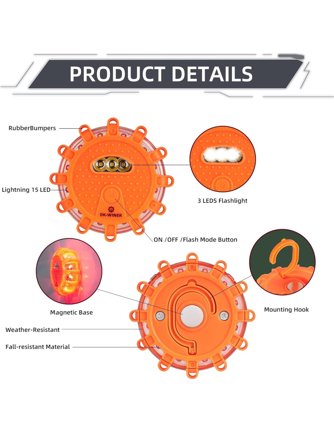 - [Flares LED para carretera 9 modos de parpadeo] : los flares de carretera de emergencia DK-WINER tienen 9 modos de iluminación opcionales, con 3 luces LED, parpadeo rotativo, parpadeo múltiple, parpadeo único, parpadeo rotativo, parpadeo alterno, SOS, brillante (alta luz), brillante (normal), muy adecuado para uso de emergencia en automóviles, fábricas, minas, lluvia, nieve y clima neblinoso.
