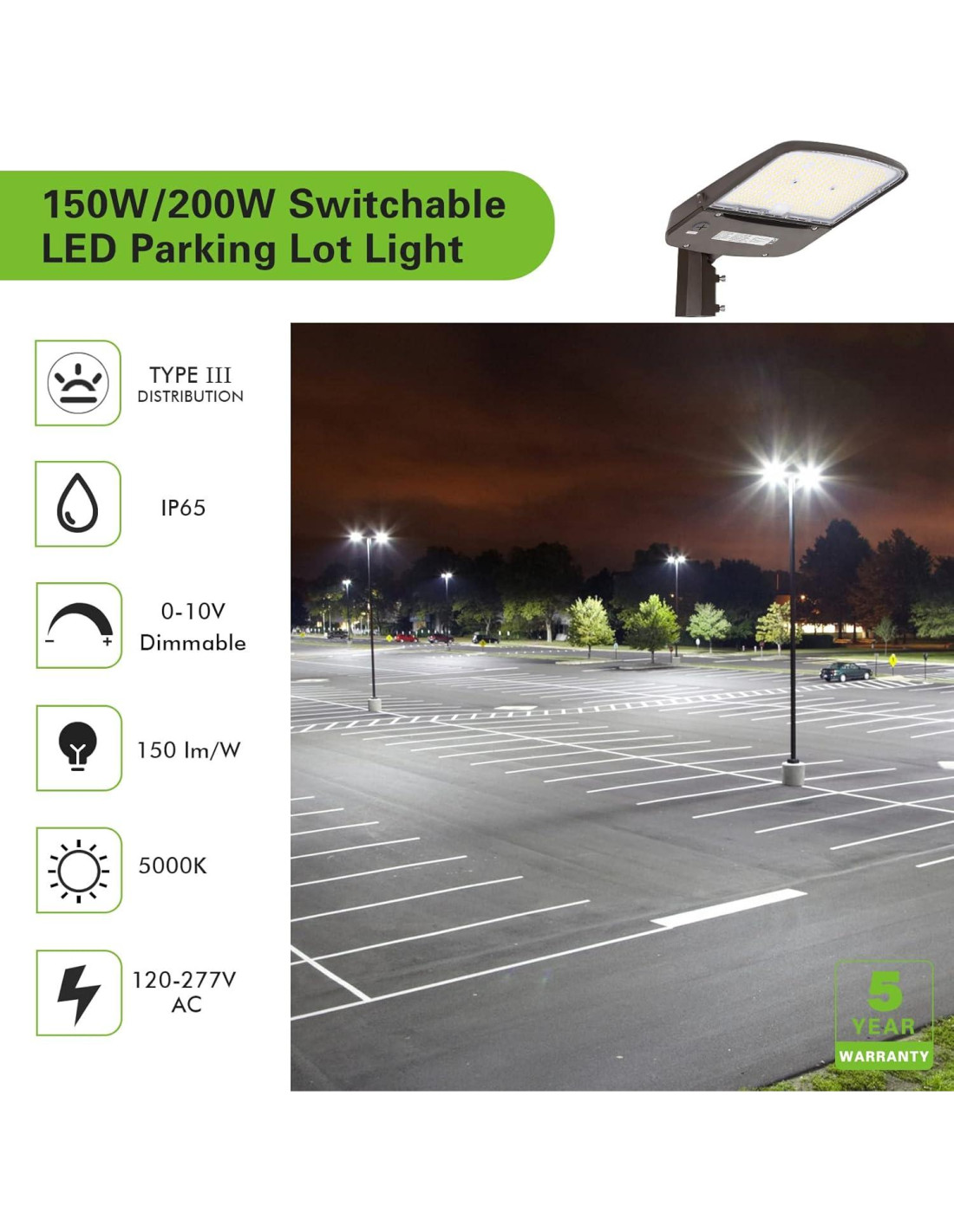 - Ahorro de Energía - Esta luz de estacionamiento LED intercambiable de 150W/200W con fotocélula proporciona 22500-30000 lúmenes a 5000K blanco diurno. Utiliza LEDs de marca con eficiencia lumínica de 150lm/W, ideal para reemplazar halogenuros metálicos tradicionales de 400W-600W, ahorros de energía de hasta el 70% durante la vida útil de nuestro producto.