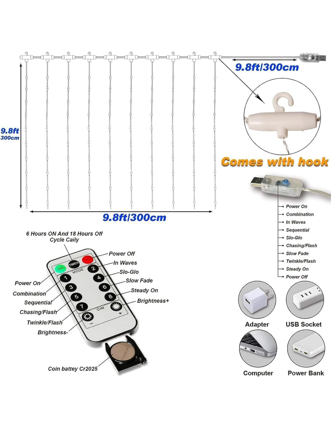 - Control Remoto con 17 Teclas Incluyendo Regulación de Brillo y Temporizador y 8 Modos de Parpadeo Comparado con el control remoto ordinario de 13 teclas, nuestro control remoto no solo puede ajustar el brillo, sino que también tiene 8 modos para elegir: combinación, forma de onda, continua, luz suave.