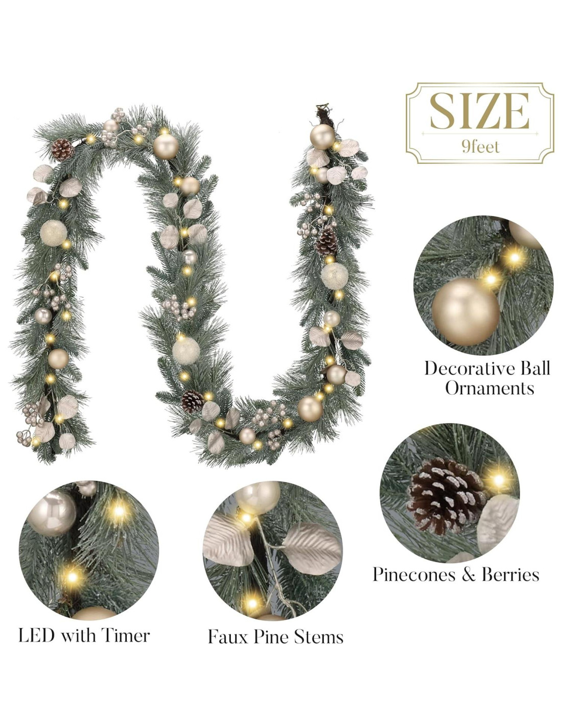 - [Accesorios Abundantes] La guirnalda navideña de 2.74 m presenta una base de rama de abeto crestwood artificial, adornada con ricos elementos como adornos navideños, piñas, bayas y más. Este diseño exquisito crea una escena clásica que aporta una atmósfera festiva encantadora. Para exhibirla en su mejor forma, retire la guirnalda de la caja y colóquela cuidadosamente, expandiéndola