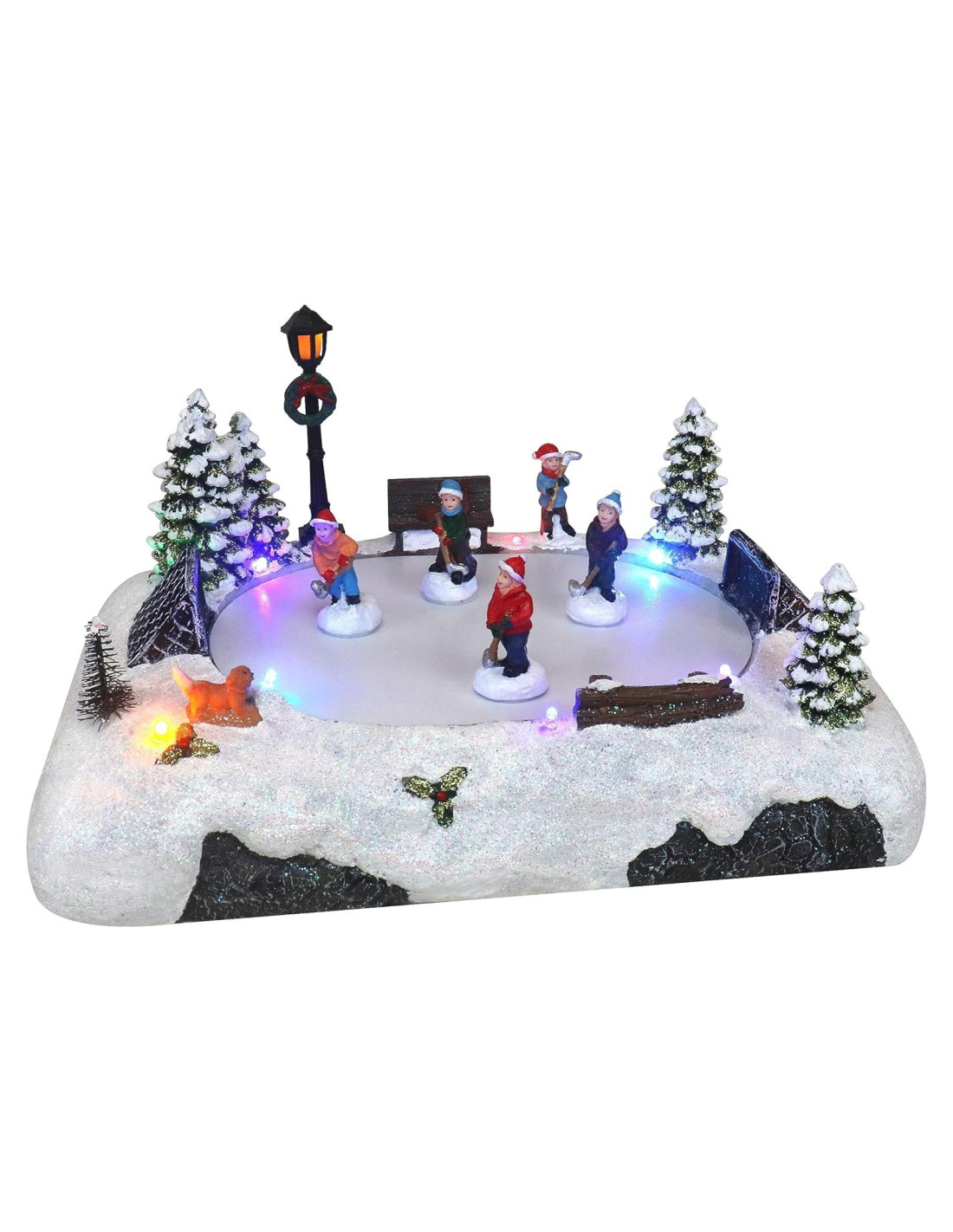 - ESPECIFICACIONES - Presenta cuatro encantadores patinadores sobre hielo deslizándose graciosamente mientras 8 melodías clásicas de Navidad suenan de fondo. Las luces cambian elegantemente de color, añadiendo un toque extra de magia a la escena. Un diseño de estanque magnético de alta calidad asegura que los cuatro patinadores se mantengan firmemente y se deslicen sin esfuerzo sin caerse del estanque. Este Pueblo de Nieve funciona con 3 pilas AA (no incluidas) y tiene un Adaptador DC (ADAPTADOR DE EE. UU. INCLUIDO). Tamaño del producto: 27.94 x 20.07 x 15.49 cm.