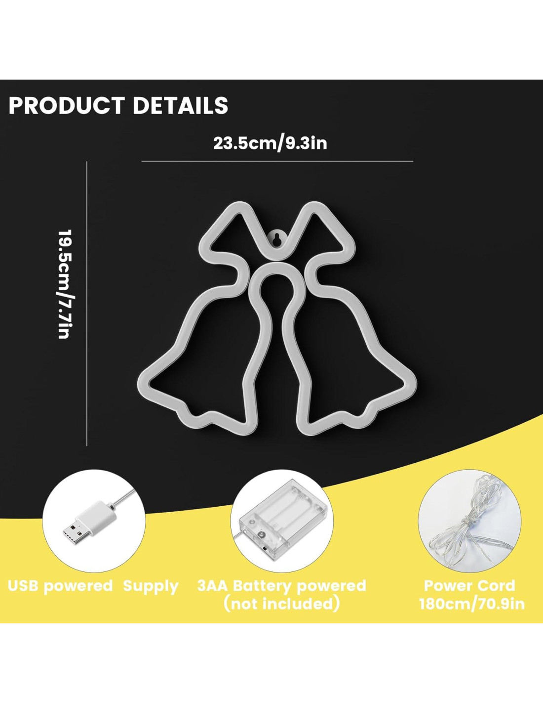 - [Campana de Navidad Amarilla Neón] Infundiendo estética contemporánea de neón con el encanto clásico de la Navidad, la señal de neón de la Campana de Navidad es una opción destacada para ti. La forma de la Campana de Navidad combina la luz neón amarilla para crear una atmósfera romántica única para tu hogar, haciendo que tu vida simple sea más interesante y llena de color.