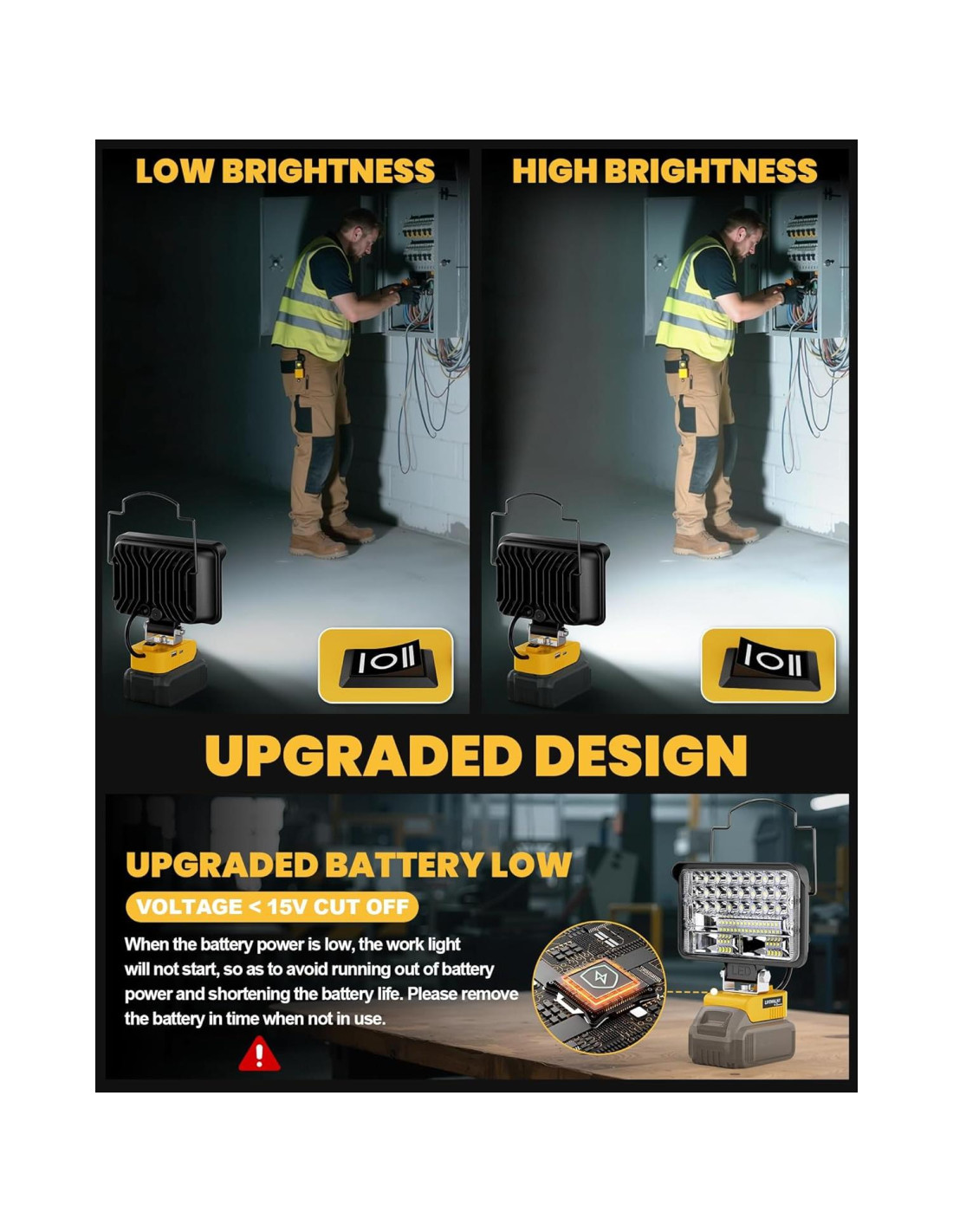 - [ALIMENTADO POR BATERÍA, SEGURO DE USAR] --Esta luz de batería está diseñada para ser compatible con baterías de litio-ion Dewalt de 20v DCB206 DCB205 DCB204 DCB181 DCB182 DCB200 DCB203 DCB205-2 DCB204-2 DCB206-2 y más (Batería NO incluida), con una placa de protección de bajo voltaje incorporada. Cuando el voltaje cae por debajo de 15v, la luz de trabajo LED se apagará automáticamente. Recordatorio Amistoso: Cuando la luz LED no esté en uso, por favor retírala de la batería para evitar la descarga de la batería.