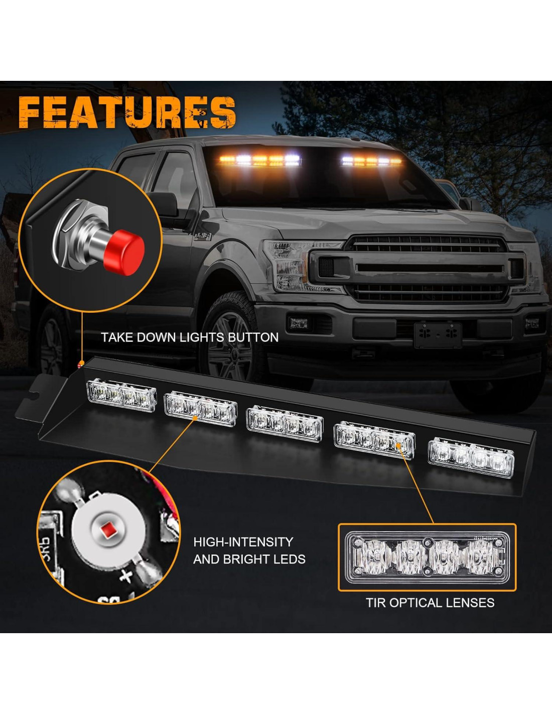 Las luces estroboscópicas para visera son lo suficientemente brillantes tanto de día como de noche. Hacen que el vehículo sea mucho más visible y seguro cuando estás respondiendo a emergencias. Perfecto tanto para montar en el parabrisas delantero. Ampliamente utilizado para vehículos de emergencia, advertencias de peligro, EMS, aplicación de la ley, POV de departamento de bomberos, EMT de respuesta rápida, camiones quitanieves, vehículos de construcción, trabajadores de servicios postales y de la ciudad, ambulancias, etc. NO es compatible con los siguientes vehículos: F150, F250, F350, Econoline, Focus, Duramax, Equinox, Durango, Ram 1500, Ram 3500, GMC Sierra 1500, Sentra, Altima, 4Runner, Mazda 3, Durango, 2016 Ford Explorer, 2016 Tahoe PPV, 2004 Chevy Silverado.