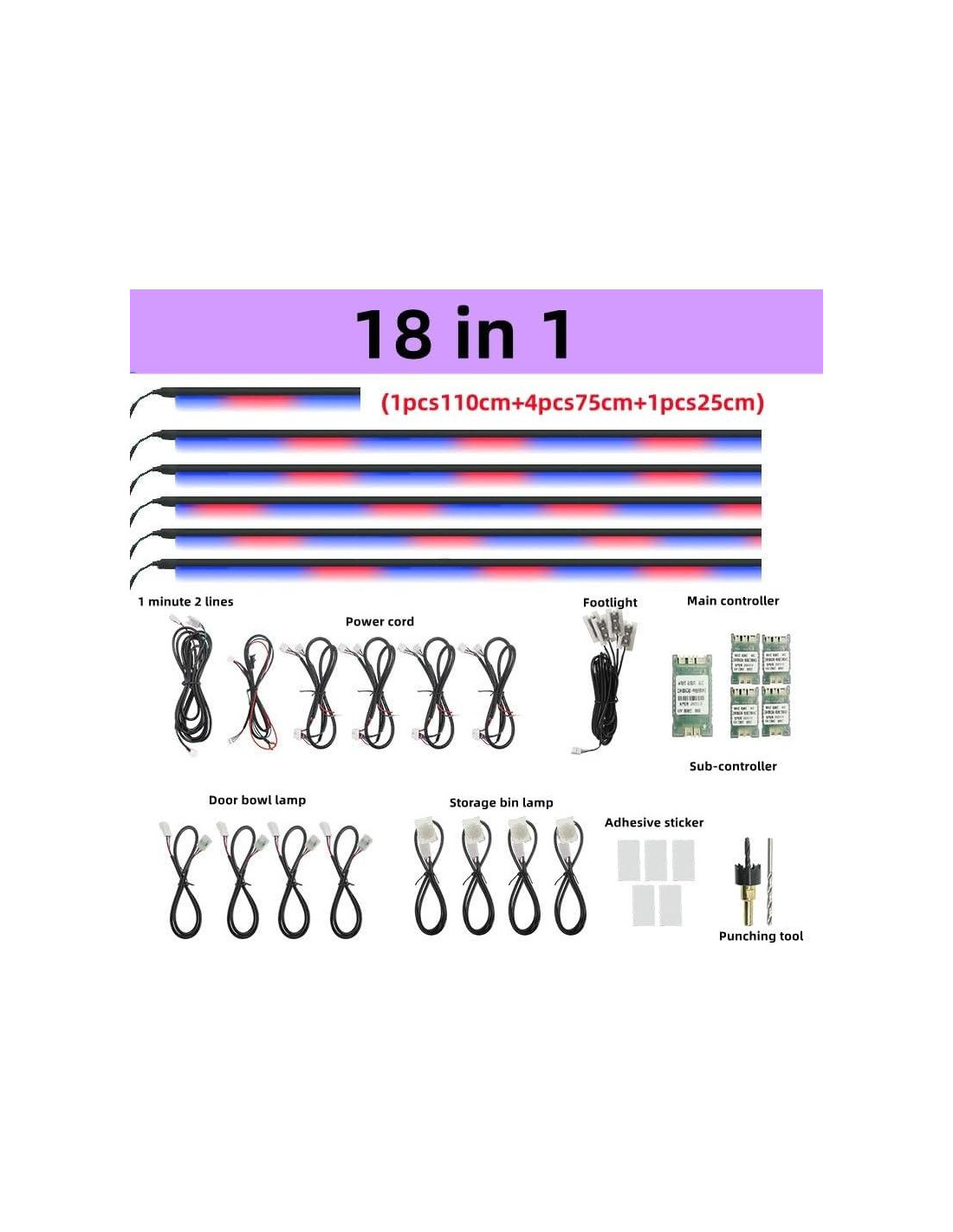 - KIT COMPLETO: conjunto de iluminación interior de coche de 18 piezas incluye tiras LED RGB, componentes de fibra óptica, arneses de cableado y accesorios de instalación