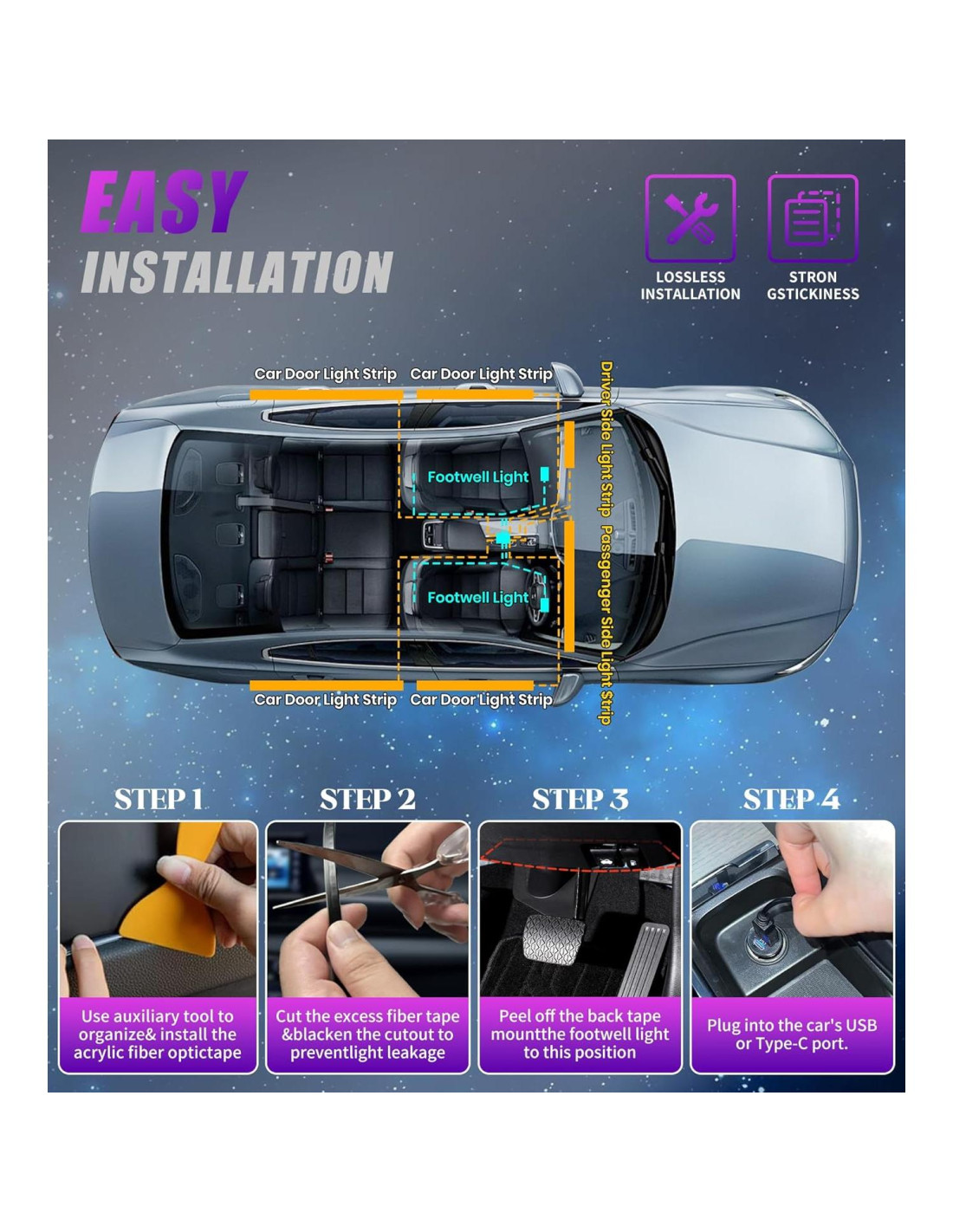 - 175'' Tiras de LED de Acrílico Ultra-Largas Este kit de iluminación ambiental cuenta con una barra de luz de acrílico extendida de 175 pulgadas (444.5 cm), mucho más larga que los kits estándar, para una iluminación suave y elegante en su tablero, molduras de puertas o zonas de pies.