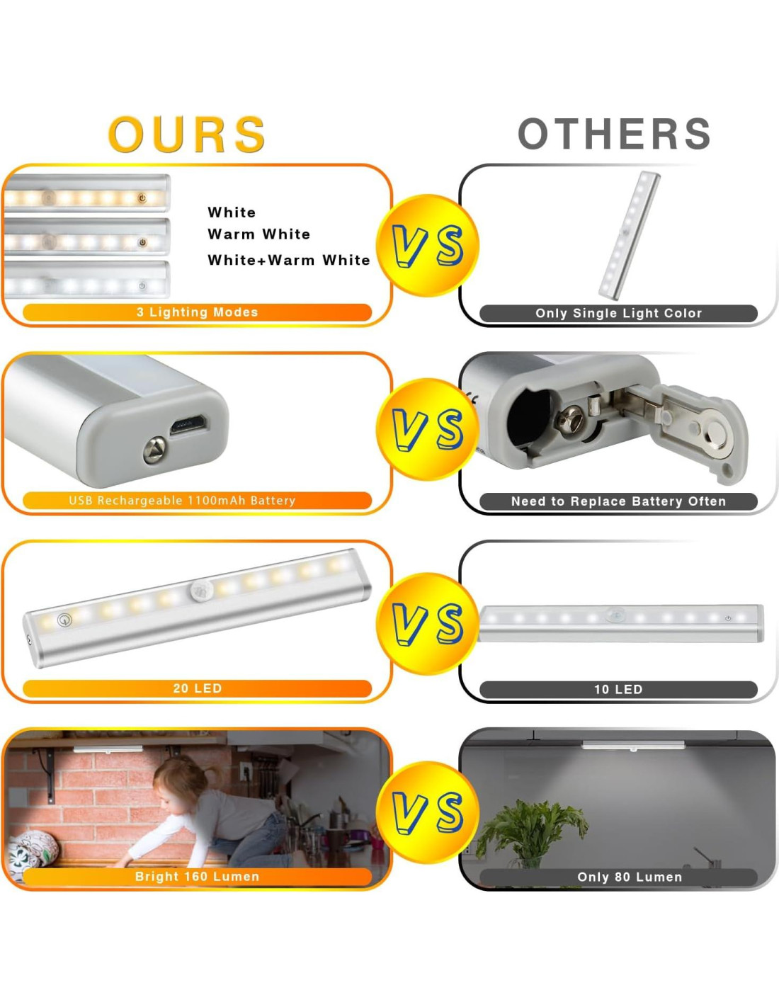 - Recargable por USB y Amplia Aplicación Batería recargable de 3.7V 1100mAh incorporada, desmonta las luces para cargarlas fácilmente, ahorra mucho dinero y tiempo en comprar baterías, tiempo de carga completo: alrededor de 2-3 horas. Iluminación perfecta para armarios de cocina en casa, estantes de cajas de zapatos, armarios, estanterías, dormitorios, escaleras, despensas, baños, sótanos, entradas, habitaciones de armarios de armas y otros espacios reducidos donde se necesita iluminación sin cables desordenados e inseguros.