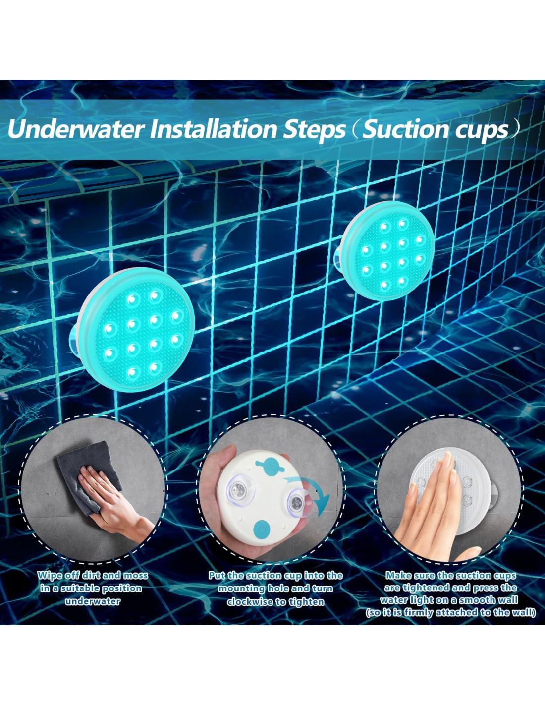 - 3 métodos de montaje: pegamento, ventosa, imán: la luz de piscina sumergible admite el método de montaje con ventosa (solo superficie lisa), y también proporciona el método de montaje con pegamento (superficie lisa o desigual). ¡El pegamento se puede raspar fácilmente con herramientas, no hay necesidad de preocuparse por pegarse a la pared de la piscina! ¡El pegamento es seguro! Cada luz LED sumergible está equipada con un super imán en su interior, no se caerá cuando se coloque sobre una superficie metálica ferrosa y se puede usar de inmediato.