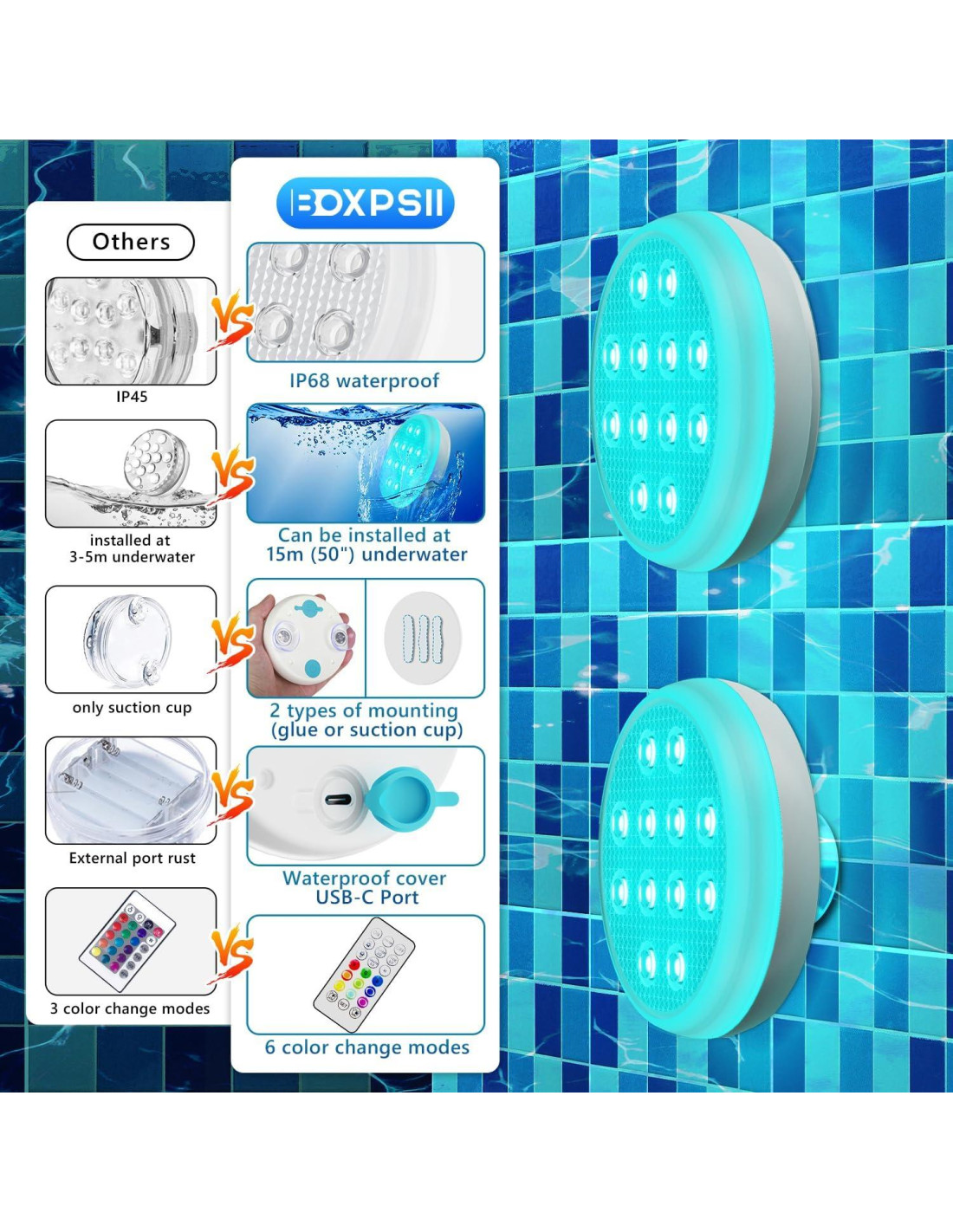 - Diseño integrado impermeable IP68 mejorado: las luces de piscina BOXPSII están hechas de materiales de alta calidad para garantizar un producto confiable y duradero. Nuestras luces de piscina tienen una apariencia delgada, excelente diseño impermeable integrado y bordes suaves. BOXPSII con impermeabilidad sellada IP68, especialmente diseñado para condiciones climáticas y ambientales adversas.