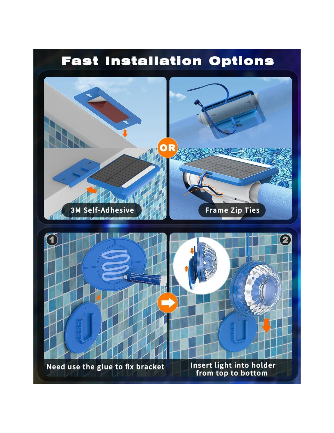 - Esta luz de piscina se adhiere de forma segura a todas las paredes/superficies de la piscina. También hay fijadores especiales para piscinas de marco. No se requiere perforación, se instala en minutos y es fácil de desensamblar. Diseñada para su uso en piscinas medianas y grandes, así como en piscinas elevadas, piscinas enterradas, estanques, fuentes y más.