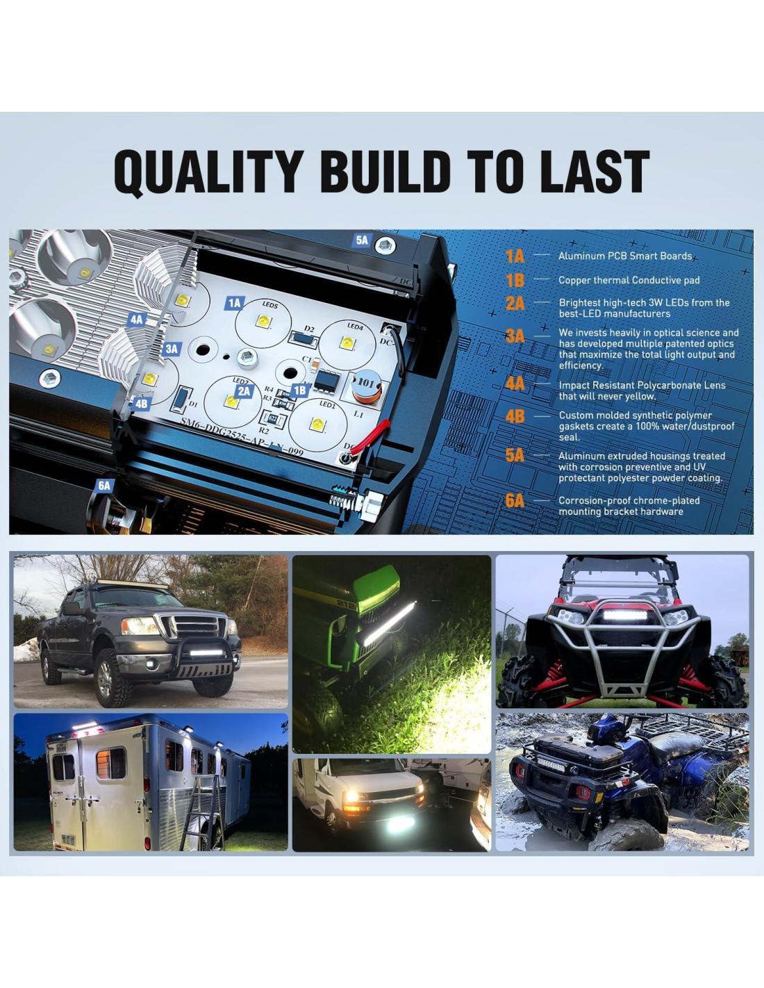 Prueba Rigurosa: perseveramos en pruebas rigurosas sobre la resistencia, durabilidad, visibilidad así como la longevidad del material para asegurarnos de que los consumidores reciban productos de alto rendimiento. 10 ventiladores de enfriamiento y carcasa de aluminio de alta calidad para una rápida disipación de calor. La almohadilla de goma impermeable y la tira de sellado de silicona como segunda protección hacen que la luz maneje mejor diferentes tipos de clima. Chips LED de alta calidad emiten luz brillante y blanca. Su combinación perfecta de haces de inundación proporciona una iluminación amplia, iluminando la oscuridad. El soporte de montaje ajustable facilita el cambio de dirección del haz de luz. 126W (42 x 3W LED de Alta Intensidad), Patrón de Haz: Inundación Spot, Lumen: 8820LM. Voltaje de Entrada: 9-30V DC (compatible con vehículos de 12V, 24V), Vida Útil: Más de 30,000 horas, Temperatura de Trabajo: -40~85 grados Celsius. Tasa de Impermeabilidad: IP67 impermeable/dustproof/antivibración/anticorrosivo. Certificaciones: CE, FCC, RoHS. Para asegurar que la unidad pueda soportar un amplio rango de temperatura sin reducir la seguridad de la salida de luz. Para asegurar que la unidad esté debidamente sellada contra el polvo y los escombros dañinos de la carretera. Para asegurar que la unidad pueda resistir la oxidación causada por la sal en áreas costeras y condiciones invernales. Para asegurar que la unidad no cause acumulación de humedad que lleve a reducir la visibilidad. Vehículos Off-Road: rail de arena, buggy, ATV, SUV, camión, tren, motocicleta, autobús, tanque, etc. Vehículos de Ingeniería: excavadora, bulldozer, rodillo de carretera, tractor, cosechadora, taladro de granos, cortadora, quitanieves, bulldozer, grúa, montacargas, etc. Otros: barco, pesca, lámpara de patio, yate, lámpara de carretera/calle, etc. Sobre Nosotros. Nilight es una marca famosa dedicada a proporcionar productos innovadores, rentables y de calidad. Hemos estado especializados en productos y piezas automotrices durante muchos años. La mejora constante y la innovación son nuestro objetivo eterno. Esperamos que tenga una compra satisfactoria aquí.