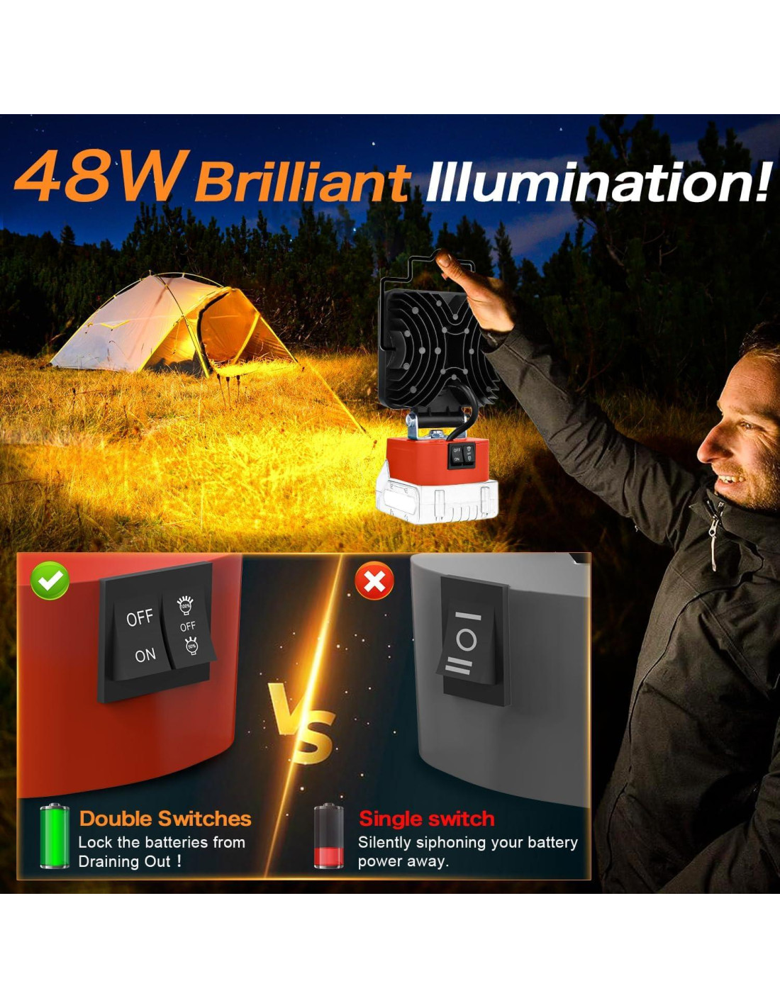 - [48W 4800LM Diseño de distribución de luz profesional, 16 perlas de lámpara dispuestas uniformemente. Dos niveles de brillo ajustable extremadamente brillante y eficiente en energía. La luz de trabajo inalámbrica para Milwaukee tiene una temperatura de color de 6000K para luz blanca fría y un ángulo ajustable de 140 grados que se adapta a diferentes entornos de trabajo. Esta es una gran opción para cualquiera que busque una iluminación confiable y eficiente]