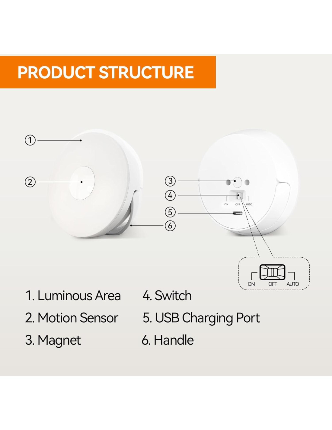 - Modo ENCENDIDO/APAGADO/AUTO: Luz nocturna recargable con sensor de movimiento, en modo AUTO, la luz se enciende cuando se detecta movimiento dentro de un rango de 100 y 3.96 metros, luego se apaga a los 30 segundos. En modo 'ENCENDIDO', la luz está siempre encendida y puede usarse como luces nocturnas de emergencia cuando se va la luz.