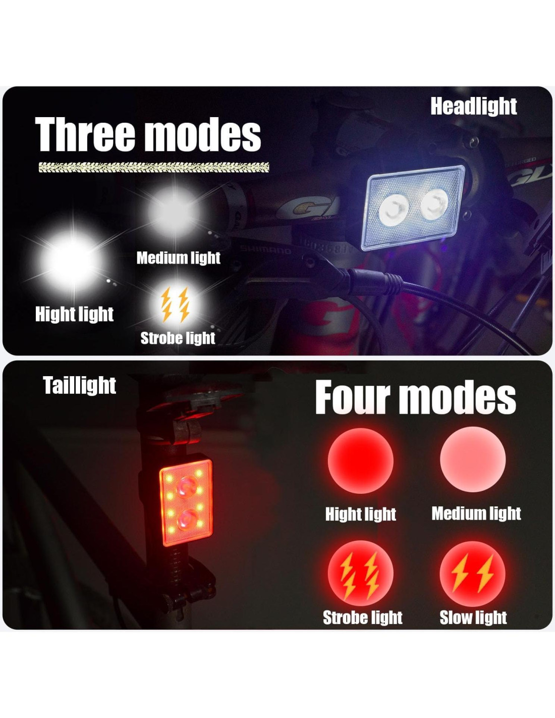- 3. Modos de Iluminación Inteligente 3+4 para Máxima Visibilidad Luz Delantera: Alta/Baja/Estroboscópica Luz Trasera: Fija/Parpadeo Lento/Parpadeo Rápido/Respiración La óptica sin deslumbramiento asegura visibilidad sin cegar a otros - esencial para montar en la ciudad y ciclismo en senderos