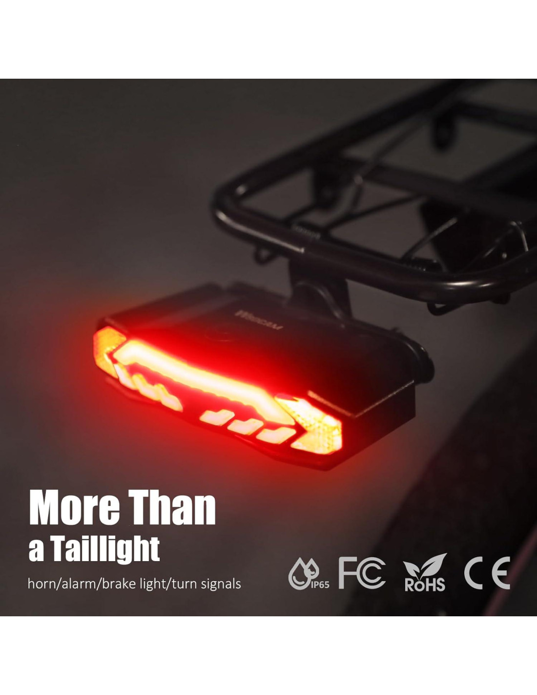 WSDCAM Luz Trasera para Portaequipajes de Bicicleta con Señales de Giro y Luz de Freno, Alarma de Cuerno de Bicicleta Inalámbrica, Recargable por USB C con Encendido/Apagado Automático, Luz Trasera para Bicicleta con Señales de Giro para Seguridad Vial