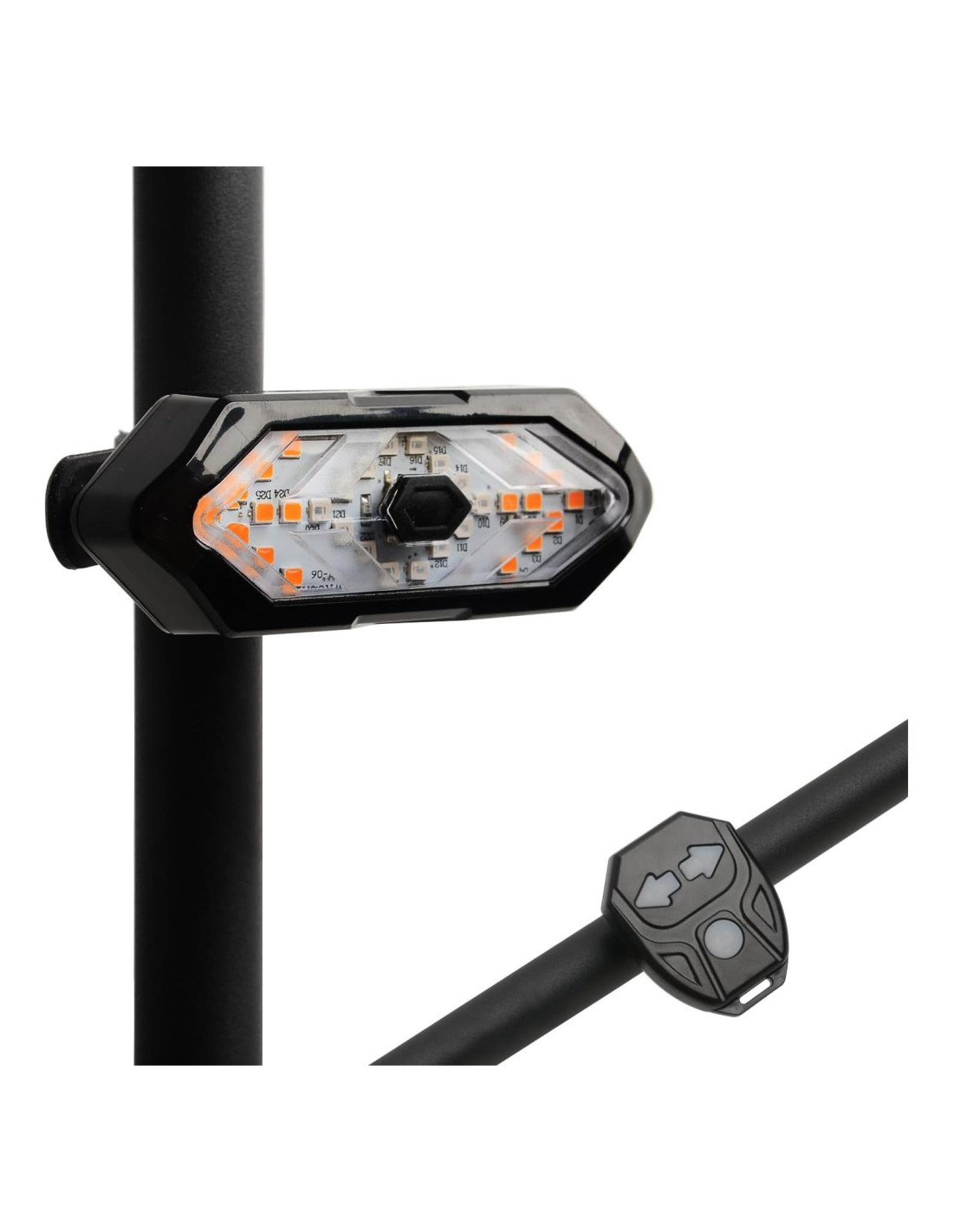 Luz Trasera de Bicicleta Mejorada JHMUERN con Señal de Giro y Control Remoto Recargable por USB Especificaciones: Material: ABS Impermeable: IPX4 Bocina: 120dB 5 Modos de Iluminación: Señal de giro izquierda (luz amarilla) + señal de giro derecha (luz amarilla) + luz roja constante + luz roja parpadeante + todo parpadea (luz roja amarilla) - Control Remoto: - Peso: 23g - Batería: batería de litio de 750mAh - Voltaje: 3.7V - Carga: USB - Carga: 2 horas - Descarga: 4 horas - Tamaño: 5.4x4.2cm (2.13x1.65") - Rango de Control: 5m (19.7") - Luz Trasera: - Peso: 38g - Tamaño: 9.4x3.2x2.6cm (3.7x1.23x1.02") - Batería de Litio: batería de litio de 750mAh - Voltaje: 3.7V - Carga: USB - Carga: 2 horas - Descarga: 4 horas - Perlas de Lámpara: SMD LED - Cantidad de Perlas de Lámpara: 32Pcs - Color de Luz: Luz roja (14pcs) - Luz de Giro: Luz amarilla (18pcs) - Paquete Incluido: 1 x Luz Trasera (Recargable por USB) 1 x Control Remoto (Recargable por USB) 1 x Cable USB 1 x Base 2 x Correa Fija de Silicona - Instalación sin Herramientas: Instalación del Control Remoto: 1. Fijar la base al manillar con correas de silicona 2. Insertar el control remoto en el soporte de montaje, completar Instalación de las Luces Traseras: 1. Fijar la base al tubo del asiento 2. Insertar las luces y completar la instalación