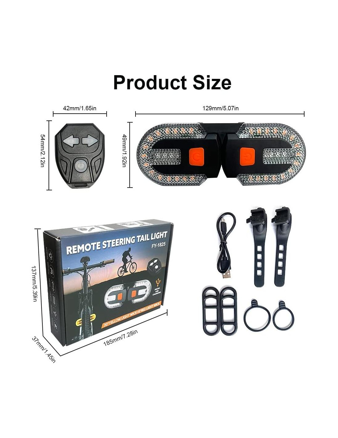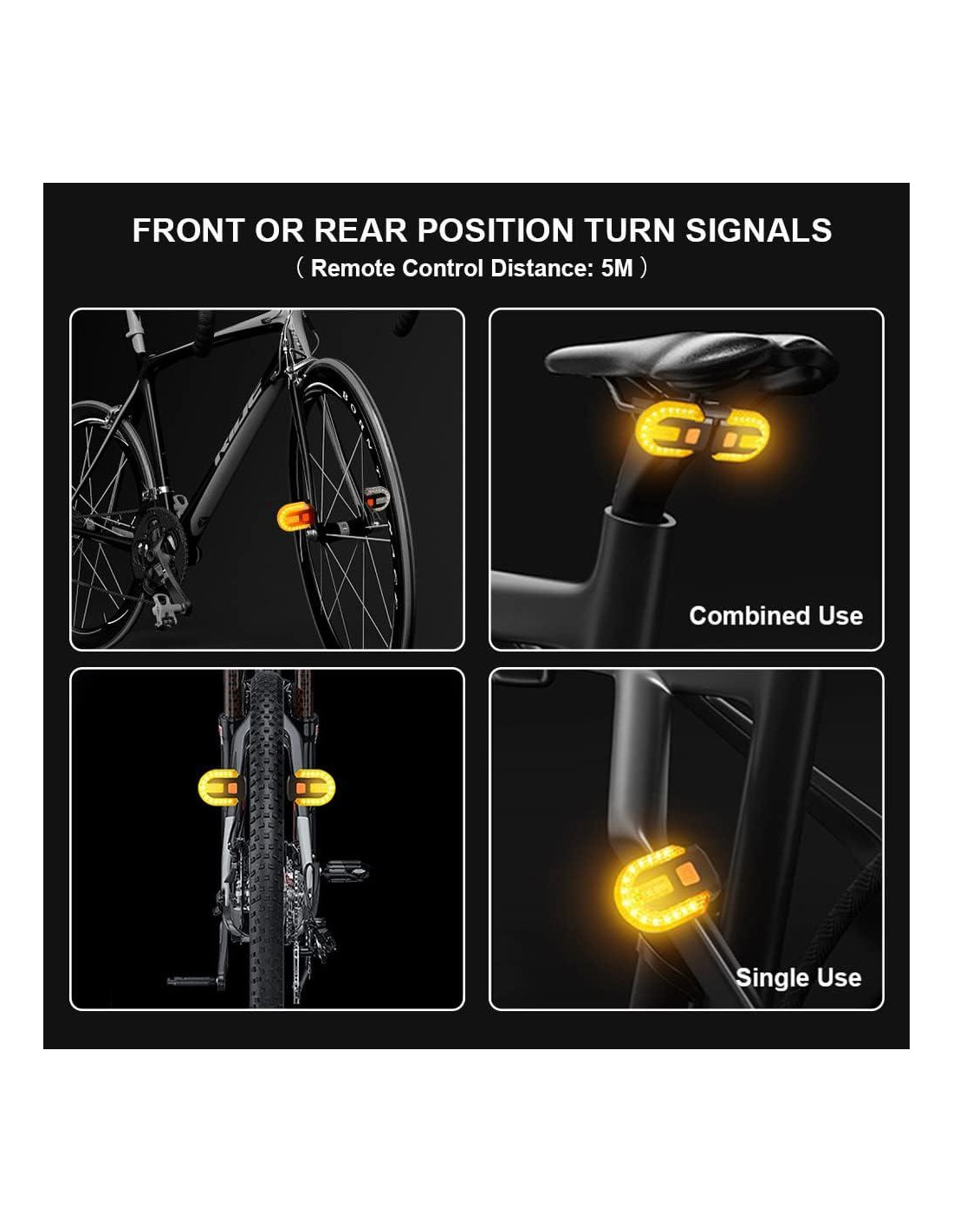- Señal de Giro con Control Remoto Inalámbrico: Equipado con un dispositivo de control remoto inteligente, puede controlar fácilmente las luces de señales de giro de la bicicleta. Hay 5 modos: Señal de Giro Izquierda/ Señal de Giro Derecha/ Luz Roja Brillante/ Luz Amarilla Brillante/ Todas las Luces Parpadean. Lo que puede atraer mejor la atención de otros ciclistas y hacer que todos monten de manera más segura (Nota: La distancia máxima de control del control remoto: 5 metros)