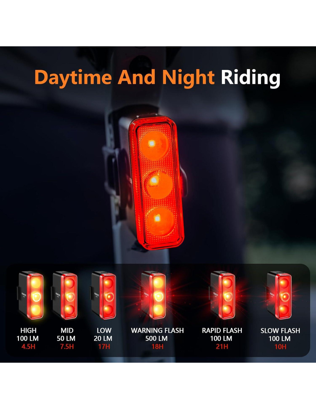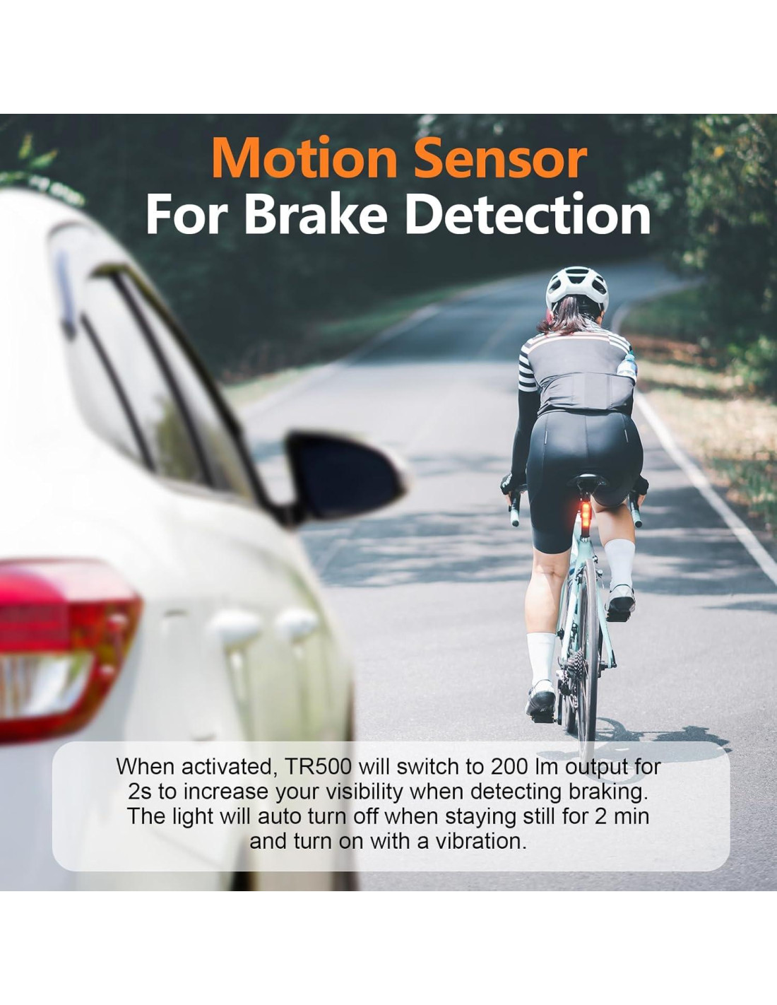 - Sensor de movimiento incorporado para detección de freno y función de encendido-apagado automático. Cuando se activa, la luz trasera de la bicicleta cambiará a una salida de 200 lúmenes durante 2 segundos para aumentar tu visibilidad al detectar el frenado. La luz se apagará automáticamente después de permanecer quieta durante 2 minutos y se encenderá con vibración.