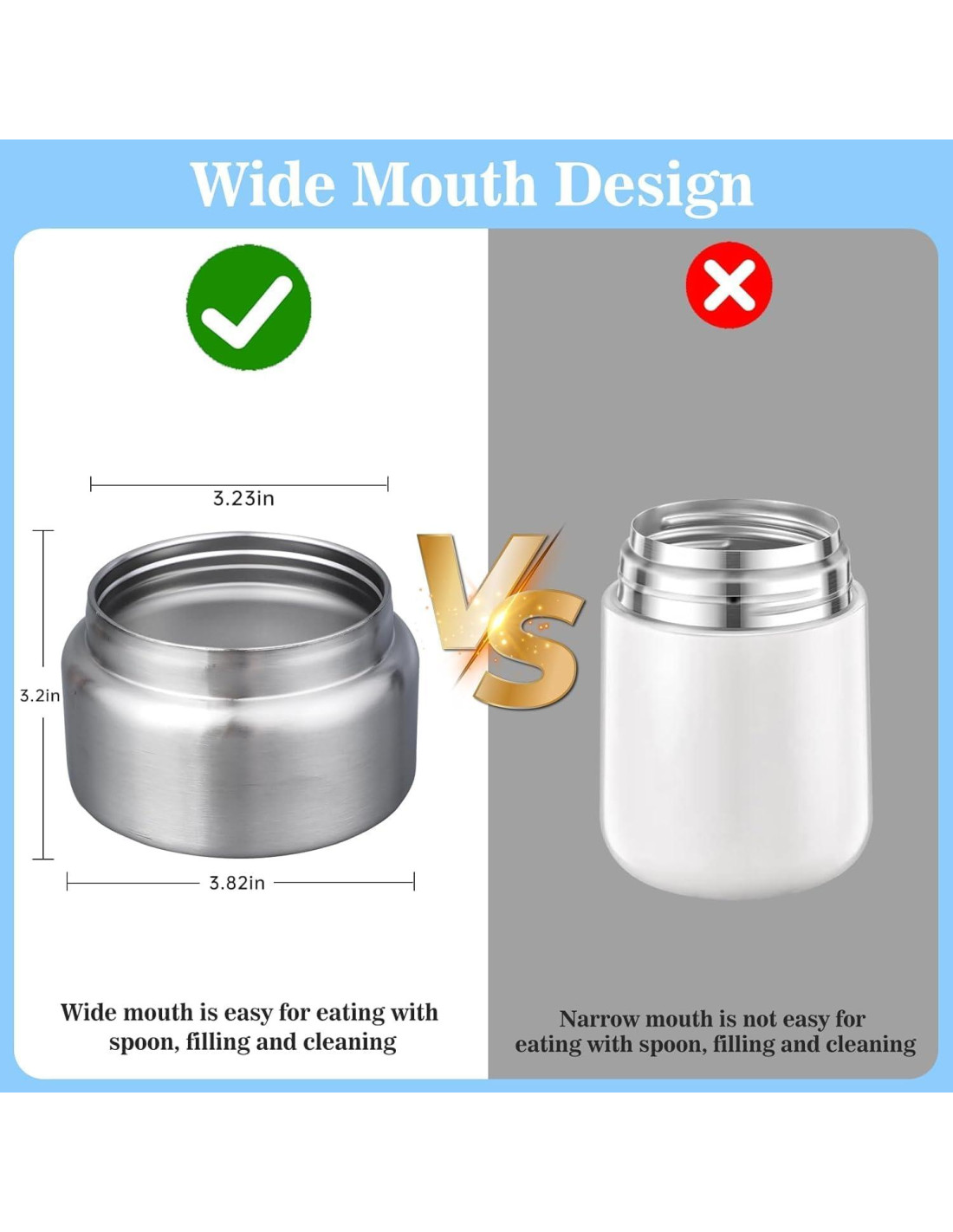 - Diseño de boca ancha para niños --- Meticulosamente diseñado, este tarro de comida cuenta con una abertura amplia para un acceso conveniente a varios contenidos como alimentos, sopa, frutas o helado. Limpiar es muy fácil gracias a la boca ancha y el interior suave, y el labio de silicona a prueba de fugas se puede quitar sin esfuerzo para una limpieza a fondo.