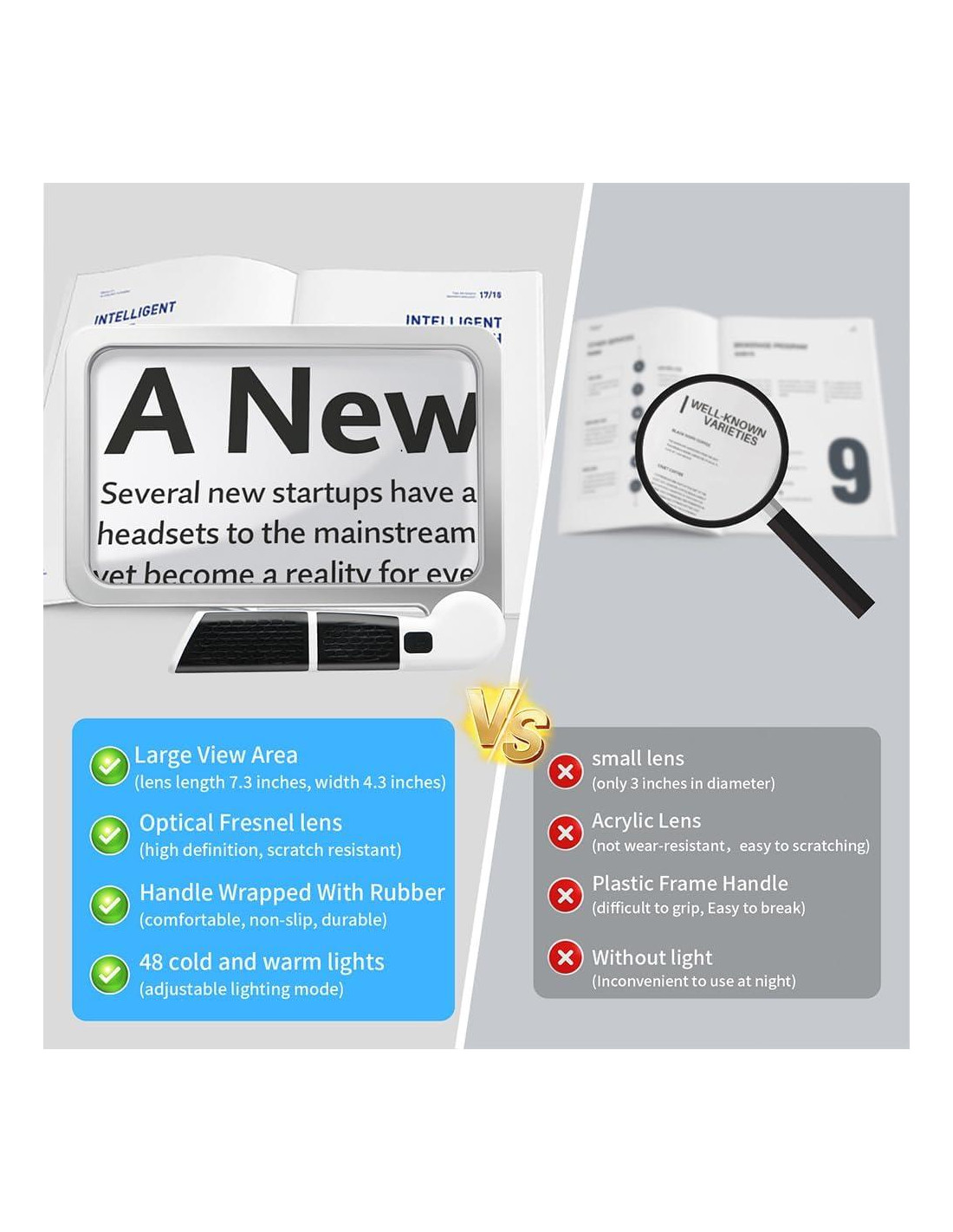 - Lente cristalina y uso versátil: experimenta una lectura cristalina con la lente de aumento HD supergrande de esta lupa de mano. Los LEDs premium utilizados en esta lupa tienen una vida útil de más de 100,000 horas. La forma rectangular la hace ideal para leer libros, periódicos, revistas, mapas, documentos, sellos, papeles, impresiones pequeñas y detalles. Es una herramienta versátil para diversas aplicaciones.