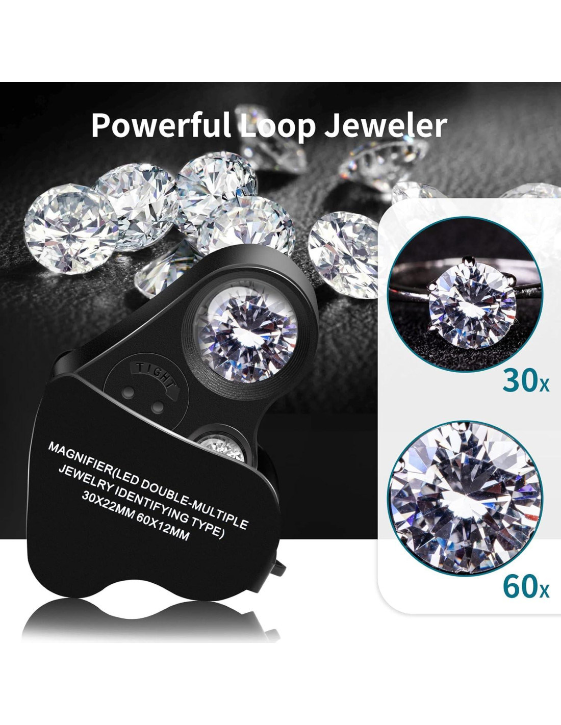 - Lupa de Joyería 30X 60X 90X: Con una luz LED incorporada y lente de luz negra UV, la lupa de diamante plegable viene con 3 lentes de aumento diferentes, 30 x 25 mm, 60 x 12 mm y 90 x 8 mm. Luces LED para proporcionar buena iluminación para claridad. Hay una luz UV para detectar minerales fluorescentes y marcas
