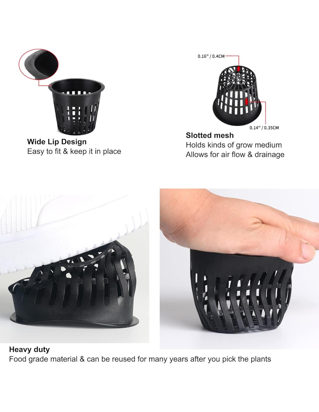 - Borde ancho más flexibilidad para encajar y reutilizable: diseño de borde extra ancho de 3.2" (8,13 cm) en la parte superior facilita encajar y mantener en su lugar y otorga más flexibilidad al taladro que uses, ya que no tienes que ser tan preciso al cortar el agujero. El borde es lo suficientemente ancho como para que no caigan a través de los agujeros pre-perforados en el poliestireno, camas de cultivo o tanques de acuaponía. Macetas de copa de red de 3 pulgadas (7,62 cm) con collar son duraderas y, por lo tanto, pueden reutilizarse después de recoger la planta.