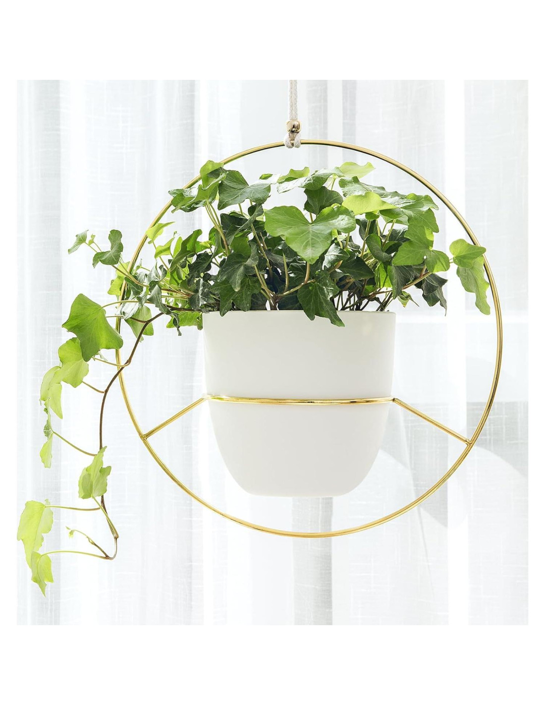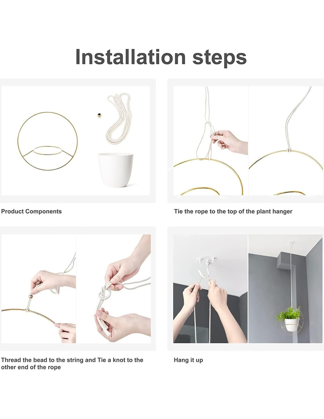 - Material: colgador de metal, cuerda de algodón y macetas de plástico. Adecuado para uso en interiores y exteriores. El anillo dorado en forma de diamante y círculo combina con la maceta redonda para iluminar la ventana, la mesita de noche, el techo, la sala de estar, el dormitorio y la cocina en tu hogar.