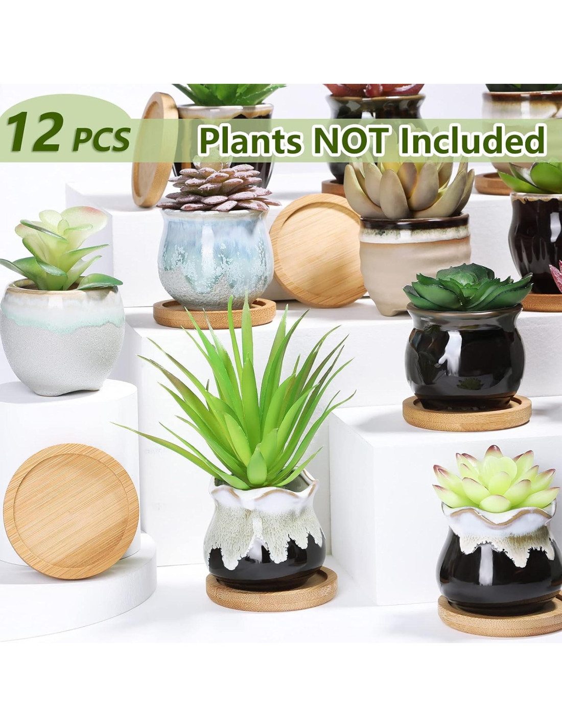 - El paquete incluye: recibirás 12 juegos de la maceta para plantas suculentas con orificio de drenaje, y cada maceta está equipada con una bandeja redonda de bambú; Hay 6 estilos diferentes para elegir, cantidad suficiente, el tamaño tiene pequeñas diferencias pero son todos similares; 2.5 x 2.15 pulgadas (ancho x alto), que es ideal para sostener suculentas