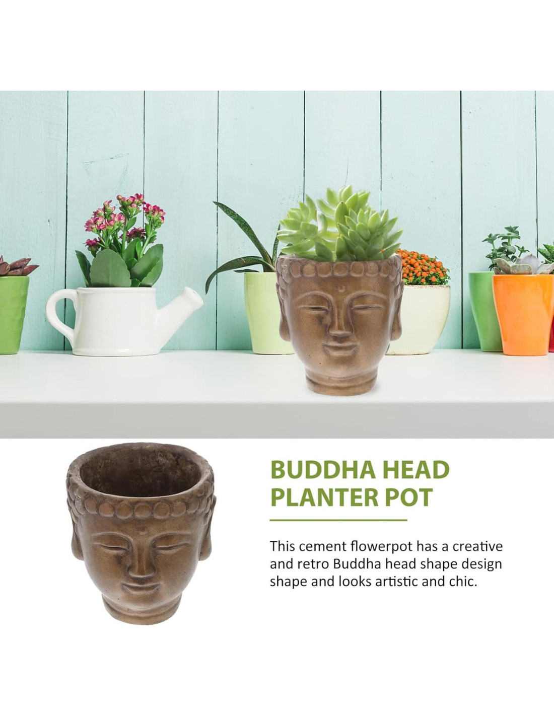 - DECORACIÓN DE MACETA DE JARDÍN Adecuada para usar en muchas ocasiones, como en casa, oficina, sala de estar, sala de estudio, etc. La forma de la cabeza de Buda, adecuada para decoración interior. Aportará encanto y belleza a tu espacio vital.