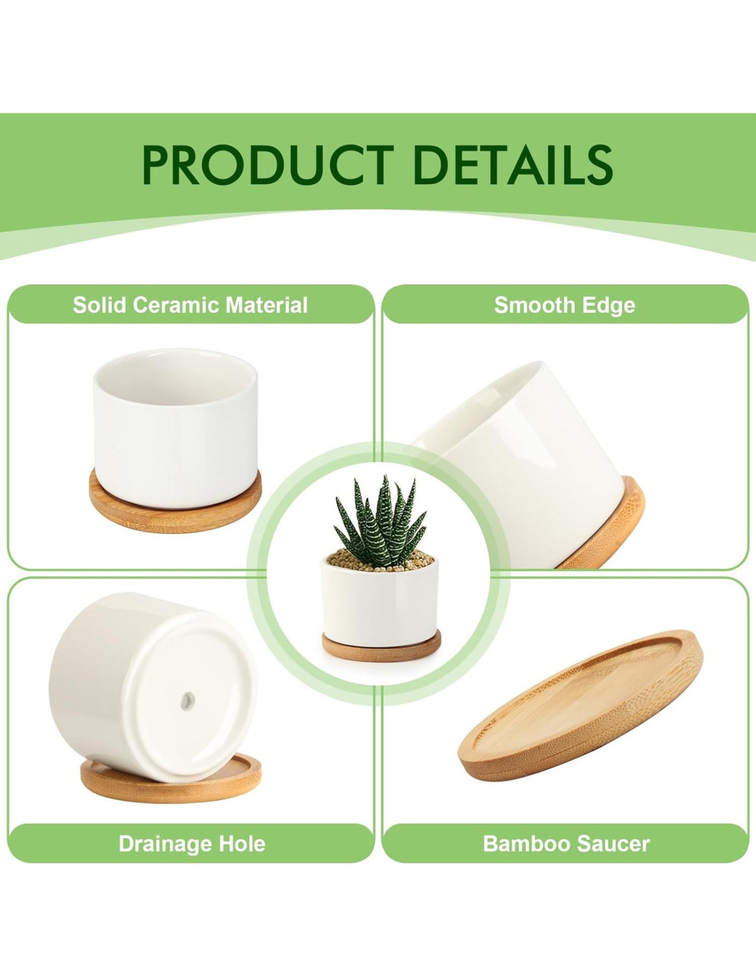 - Kit de Macetas Suculentas Gran Valor: Paquete de 6 macetas suculentas pequeñas con drenaje y bandeja de bambú son ideales para pequeñas plantas, suculentas, hierbas o flores pequeñas. Una gran manera de llevar un toque de naturaleza a tus espacios interiores. (Plantas no incluidas)