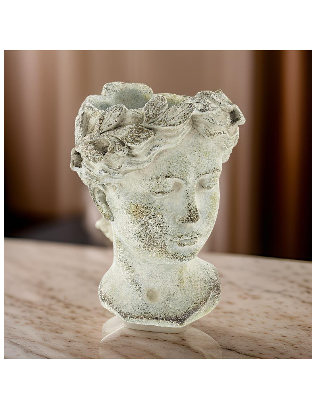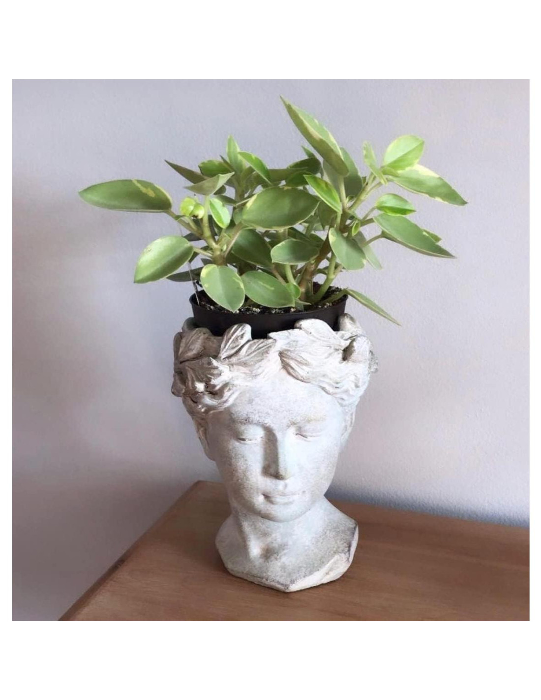 Este macetero de cemento está diseñado de manera única como una estatua de la era grecorromana. La estatua de la cabeza de una diosa femenina está terminada en un estilo envejecido y desgastado para realzar el aspecto antiguo. Es una gran pieza para exhibir pequeñas plantas, hierbas y suculentas en interiores o exteriores. La estatua mide 23 cm de alto x 13 cm de ancho con un área de plantación aproximada de 13 cm de alto x 10 cm de ancho.