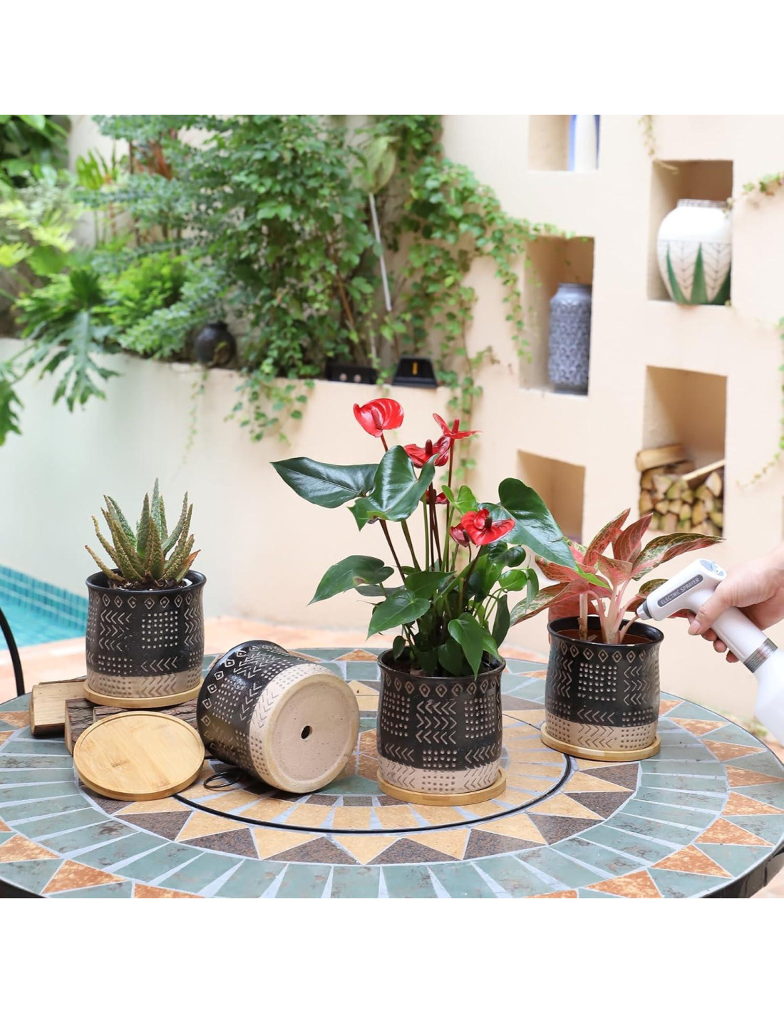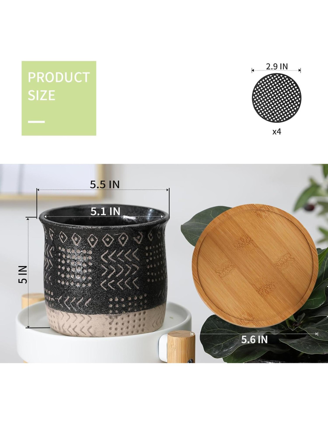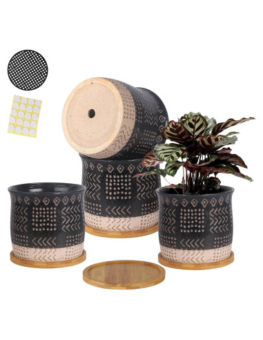 - Agujero de Drenaje y Bandejas de Bambú - Este agujero de drenaje en la parte inferior permite que el exceso de agua salga del suelo cuando riegas la planta. Y este juego de macetas viene con bandejas de bambú para recoger el exceso de agua, que es adecuado para plantar en interiores y exteriores.