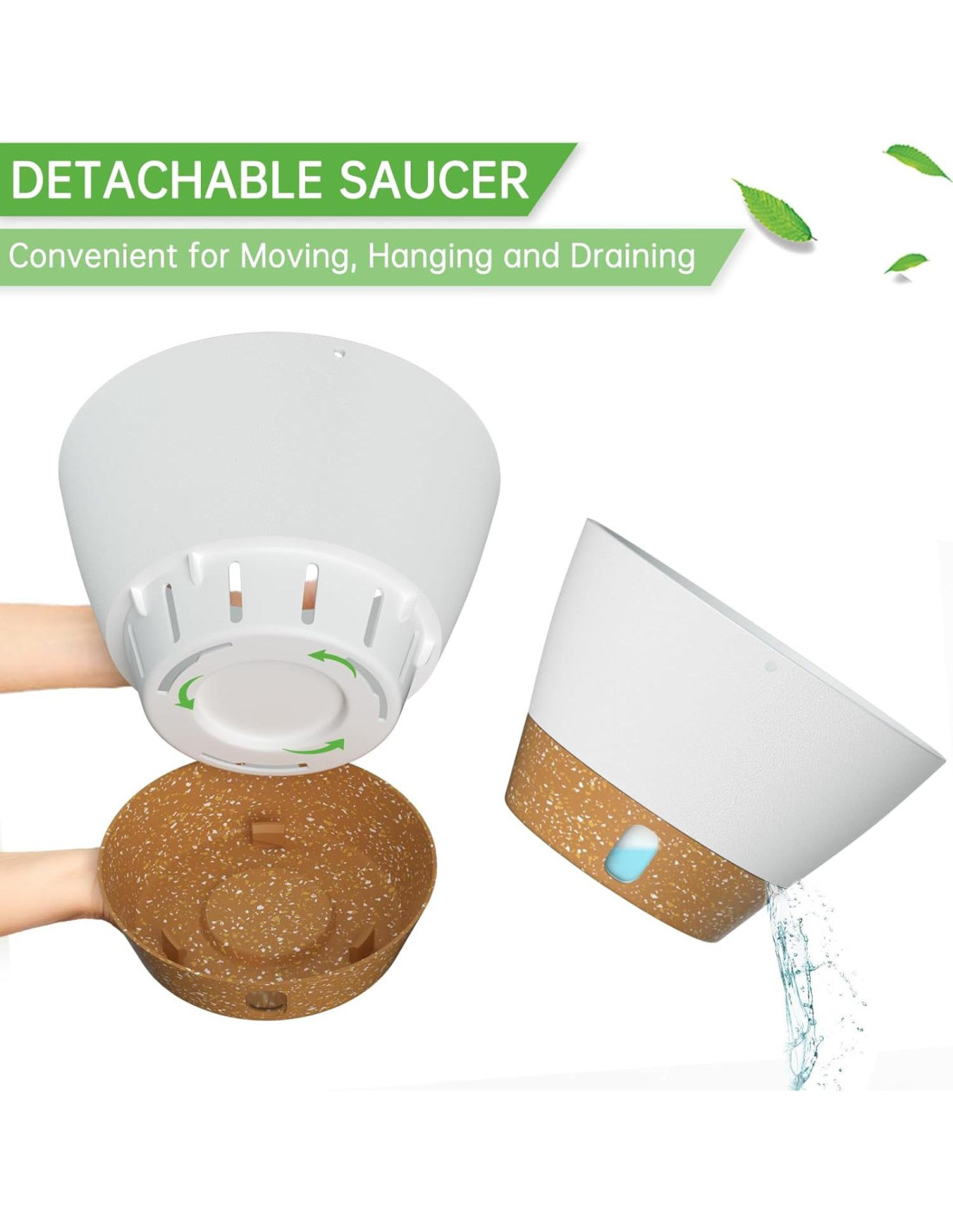 - Bandeja con nivel de agua visible: La bandeja se puede quitar para facilitar la limpieza de la maceta. La maceta autorriego con orificios de drenaje puede drenar el exceso de agua a la bandeja, por lo que la bandeja almacenará una cantidad de agua para la planta (más de 7 días). Y puedes regar las plantas mirando el nivel de agua.