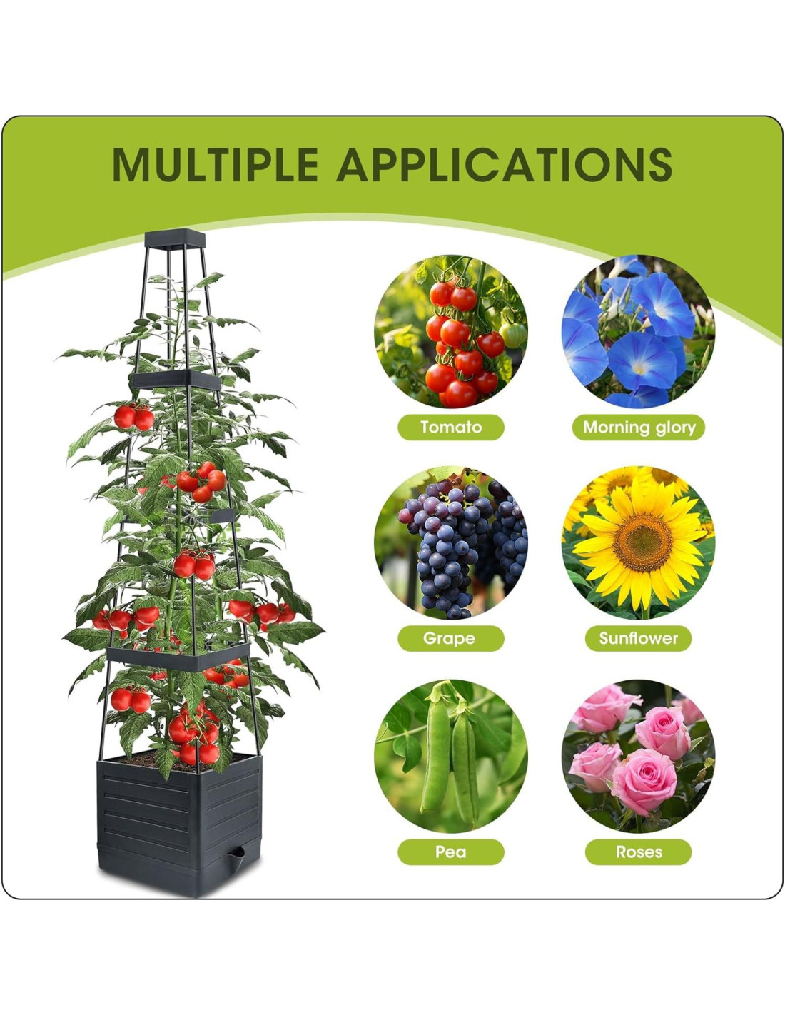 - USO AMPLIO: ¿Quieres cultivar verduras o flores pero no tienes espacio? Considera esta innovadora maceta de tomate autorriego para plantas trepadoras como tomates, guisantes, papas, gloria de la mañana, rosas y más. Se puede usar durante todo el año, colocada afuera cuando hace calor y movida adentro o en el balcón cuando hace frío para permitir que las plantas sigan creciendo.
