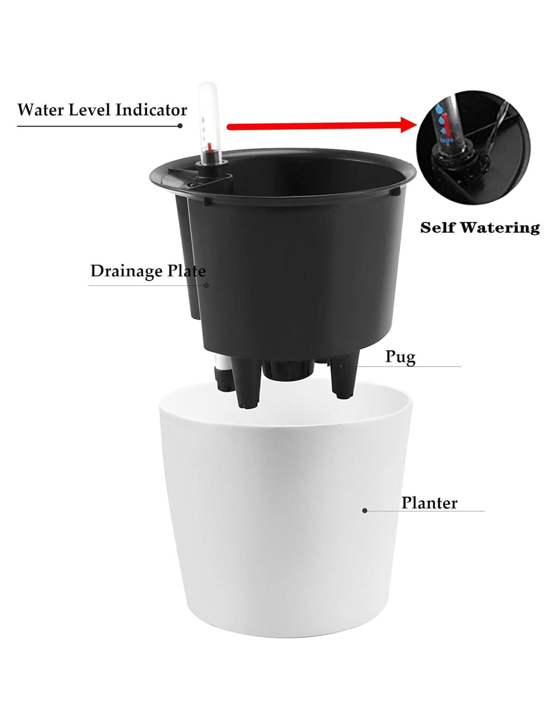 - DISEÑO DE ORIFICIOS DE DRENAJE - Los orificios de drenaje en la maceta interior ayudan al flujo de agua desde el tanque hasta la parte inferior de la flor. La maceta puede drenar el exceso de agua y evitar que las raíces de la flor se pudran. La flor respira y se expande libremente sin ningún obstáculo, creciendo así de manera robusta.