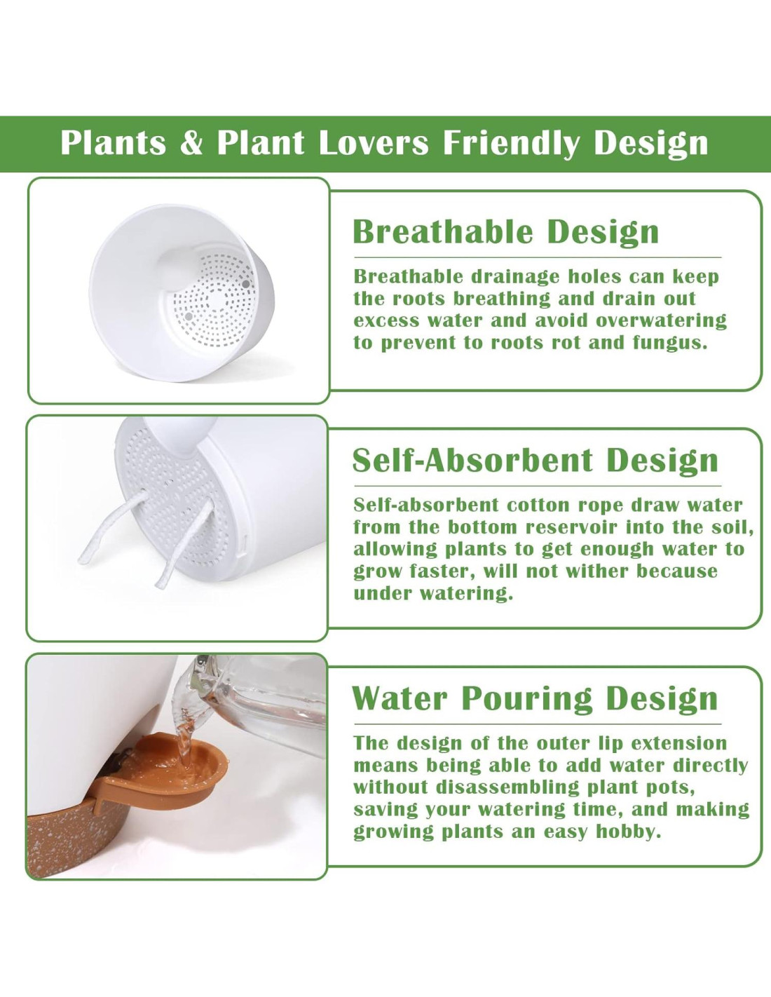 Descripción del producto Mckanti macetas autorriego con cuerda absorbente y bandejas desmontables. Parámetros del producto -Ajuste perfecto para todo tipo de estilo de la habitación: estética moderna minimalista y acabados mate limpios que aportan un estilo minimalista para adaptarse a cualquier lugar. -Diseño único de múltiples orificios de drenaje: disposición única de múltiples orificios de drenaje diseñada para proporcionar mejor infiltración de agua y aire, proporcionando el mejor ambiente para el crecimiento de las plantas. -Reservorio independiente: aísla completamente el entorno de crecimiento de las plantas del entorno de almacenamiento de agua. El nivel de agua se puede monitorear. Ya no te preocupes si accidentalmente agregas demasiada agua, tus plantas se inundarán y el exceso de agua se drenará automáticamente a través de la abertura. -Paquete de 5 macetas autorriego con 5 cuerdas absorbentes.