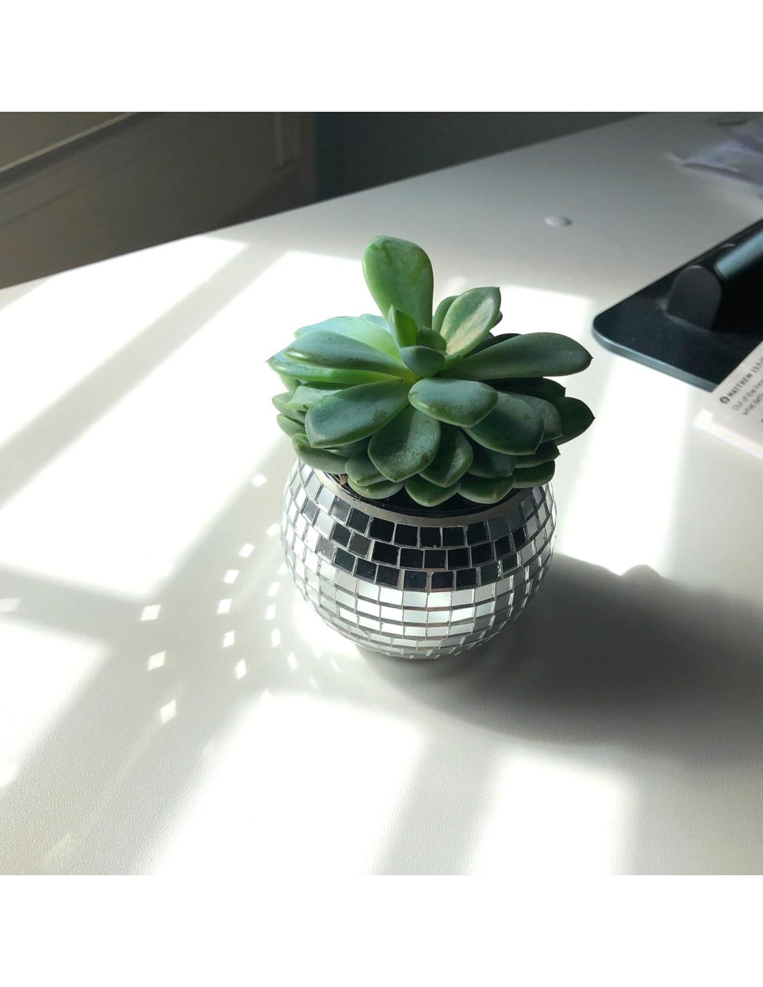 - La mini maceta de bola de disco está decorada con innumerables piezas de espejo diminutas, cada una cuidadosamente colocada a mano para crear un país de maravillas reflectante que captura y danza con la luz desde todas las direcciones. También es el hogar perfecto para plantas pequeñas que prosperan con un riego mínimo como cactus, suculentas y la planta de eucalipto. Esta joya de decoración para el hogar aporta un toque de magia y un toque de estilo exquisito a cualquier espacio.