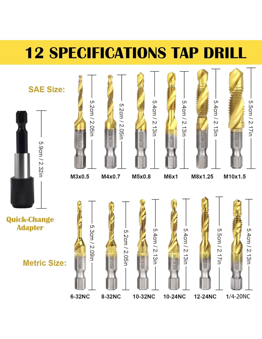- Juego versátil: Nuestro juego de brocas y machos está diseñado para satisfacer todas tus necesidades de perforación y roscado. Con una combinación de 6 tamaños SAE (6-32NC ~ 1/4-20NC) y 6 tamaños métricos (M3 ~ M10), este juego cubre una amplia gama de aplicaciones, siendo perfecto tanto para profesionales como para entusiastas del bricolaje