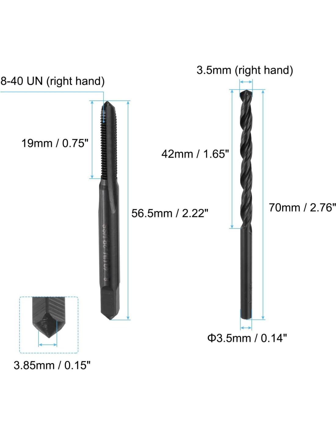 - Juego de Brocas y Machos: Tamaño de rosca del macho: 8-40 UN (derecha); tamaño de la broca de espiral: 3.5mm (derecha). El juego de machos y brocas de acero rápido 6542 (M2) ofrece excelente resistencia al calor y dureza para durabilidad y longevidad, y buen rendimiento de corte para agujeros limpios y precisos.