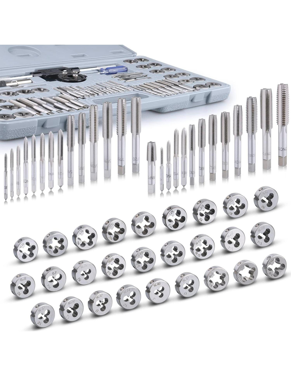 - TAMAÑOS MÁS POPULARES - El juego incluye (20) machos y matrices métricas: M3x0.5, M4x0.7, M5x0.8, M6x1.0, M7x1.0, M8x1.25, M9x1.25, M10x1.0, M10x1.5, M12x1.75; (20) machos y matrices fraccionarias SAE para rosca gruesa (UNC): 4-40 NC, 6-32 NC, 8-32 NC, 10-24 NC, 12-24 NC, 1/4-20 NC, 5/16-18 NC, 3/8-16 NC, 7/16-14 NC, 1/2-13 NC; (12) machos y matrices fraccionarias SAE para rosca fina (UNF): 10-32 NF, 1/4-28 NF, 5/16-24 NF, 3/8-24 NF, 7/16-20 NF, 1/2-20 NF; (2) macho y matriz NPT: 1/8-27 NPT