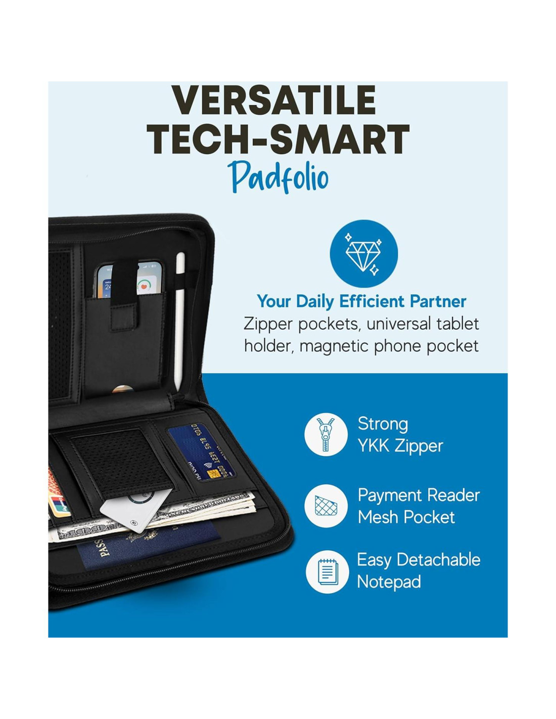 - Padfolio con Cremallera: Presenta un bolsillo de malla para lector de pagos, dos bolsillos para documentos, un bolsillo transparente para identificación, tres ranuras para tarjetas de crédito, un bolsillo para bolígrafo/stylus, un bolsillo para accesorios, un bolsillo para teléfono/banco de energía, y un bolsillo externo con cremallera para almacenamiento organizado