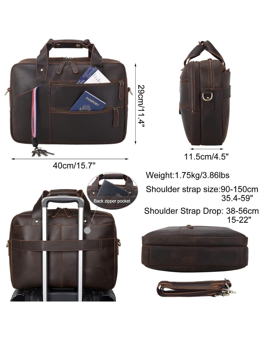 - [Correa para Carro y Cremalleras YKK] La bolsa de computadora de cuero para hombres tiene una funda para carro en la parte posterior para sostenerse en una maleta con ruedas y permitirte viajar ligero. Cremalleras de metal YKK con deslizadores dobles, herrajes de metal de bronce de alta resistencia, forro resistente a desgarros grueso, costuras exquisitas y remaches reforzados, asa de cuero acolchada cómoda hecha por artesanos calificados aseguran la longevidad y buena experiencia de transporte del maletín de cuero marrón para hombres.