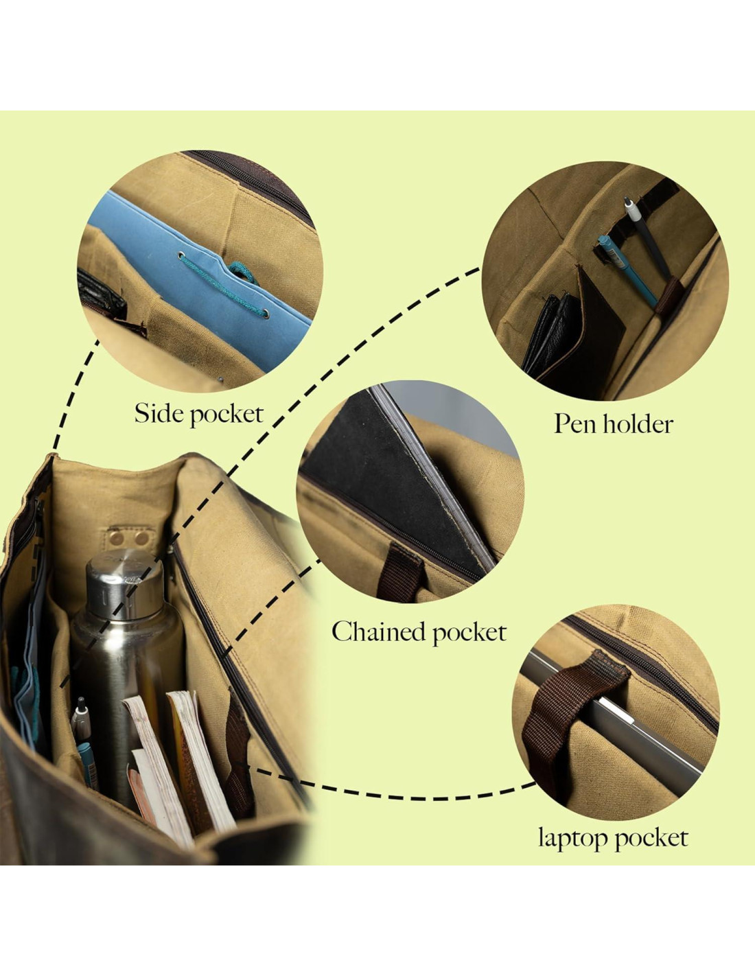 - AMPLIO ESPACIO PARA ORGANIZAR - nuestra bolsa de mensajero de cuero premium está dedicada a un compartimento acolchado para laptop. Además, hay dos compartimentos para archivos y libros, junto con dos bolsillos con cremallera para asegurar documentos esenciales. Dentro, un bolsillo especializado está diseñado para sostener tu teléfono móvil. Un bolsillo externo en la parte frontal de la bolsa para acceso rápido y dos bolsillos laterales. Un bolsillo con cremallera en la parte posterior asegura un acceso sin esfuerzo a tus pertenencias.