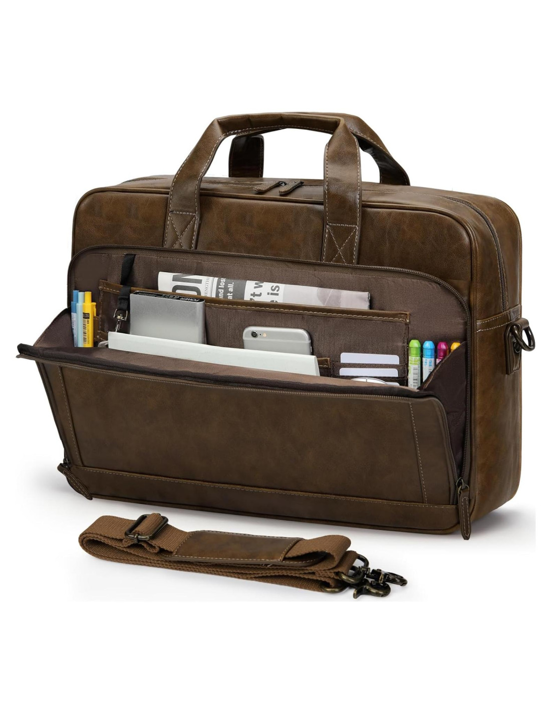 - Gran Capacidad y Múltiples Bolsillos: La bolsa de laptop de cuero tiene compartimentos espaciosos que proporcionan espacio separado para una laptop de 16 pulgadas (40,64 cm), iPad, documentos y todas tus pertenencias. Tiene múltiples bolsillos, incluyendo un bolsillo acolchado para laptop y un compartimento principal con un bolsillo con cremallera. El compartimento frontal tiene múltiples ranuras y un llavero. Hay un bolsillo con cremallera en la parte frontal para un fácil acceso a objetos personales. Mantiene todo organizado y al alcance, lo que la convierte en un maletín de negocios perfecto para hombres.