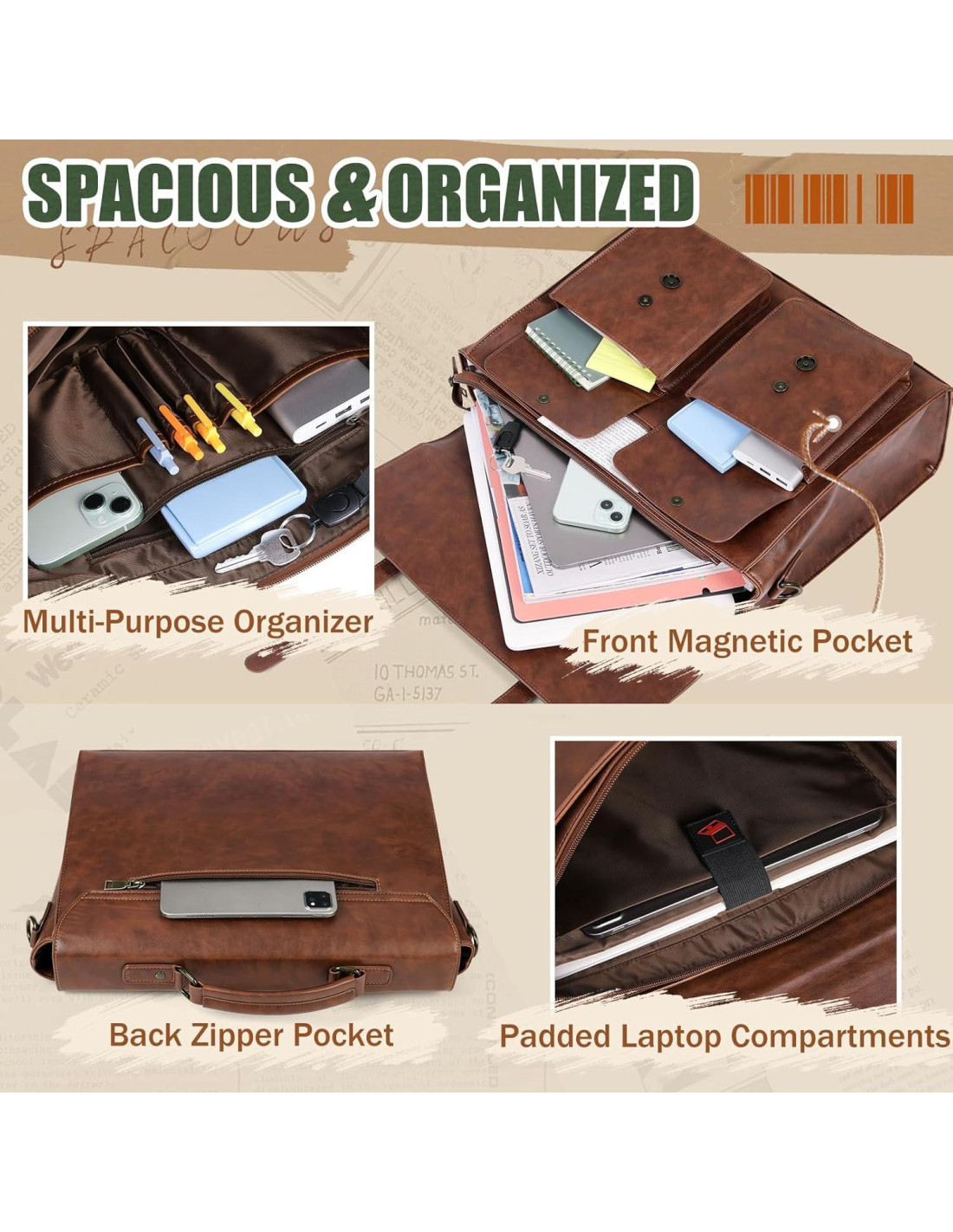 - Espaciosa y Organizada de Manera Reflexiva: Diseñada para la eficiencia, esta bolsa de mensajero vintage para hombres incluye un compartimento acolchado dedicado para portátiles que se adapta a portátiles de hasta 17.3" (43.9 cm), además de espacio para un iPad o tableta. El compartimento principal sostiene fácilmente libros, carpetas y documentos. Un organizador de múltiples bolsillos en el interior cuenta con 4 soportes para bolígrafos, 2 bolsillos deslizantes, 1 bolsillo con cremallera y un llavero desmontable - manteniendo todos tus esenciales de trabajo y viaje en orden sin desorden.