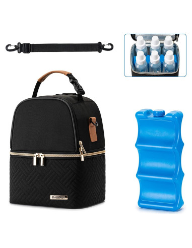- Compartimentos de Doble Capa: El compartimento superior de la bolsa para extractor de leche materna sostiene extractores de leche y accesorios, el compartimento inferior sostiene biberones. Además de almacenar leche materna, la bolsa enfriadora para biberones puede usarse como una bolsa de almuerzo para almacenar frutas refrigeradas, almuerzos u otros alimentos.